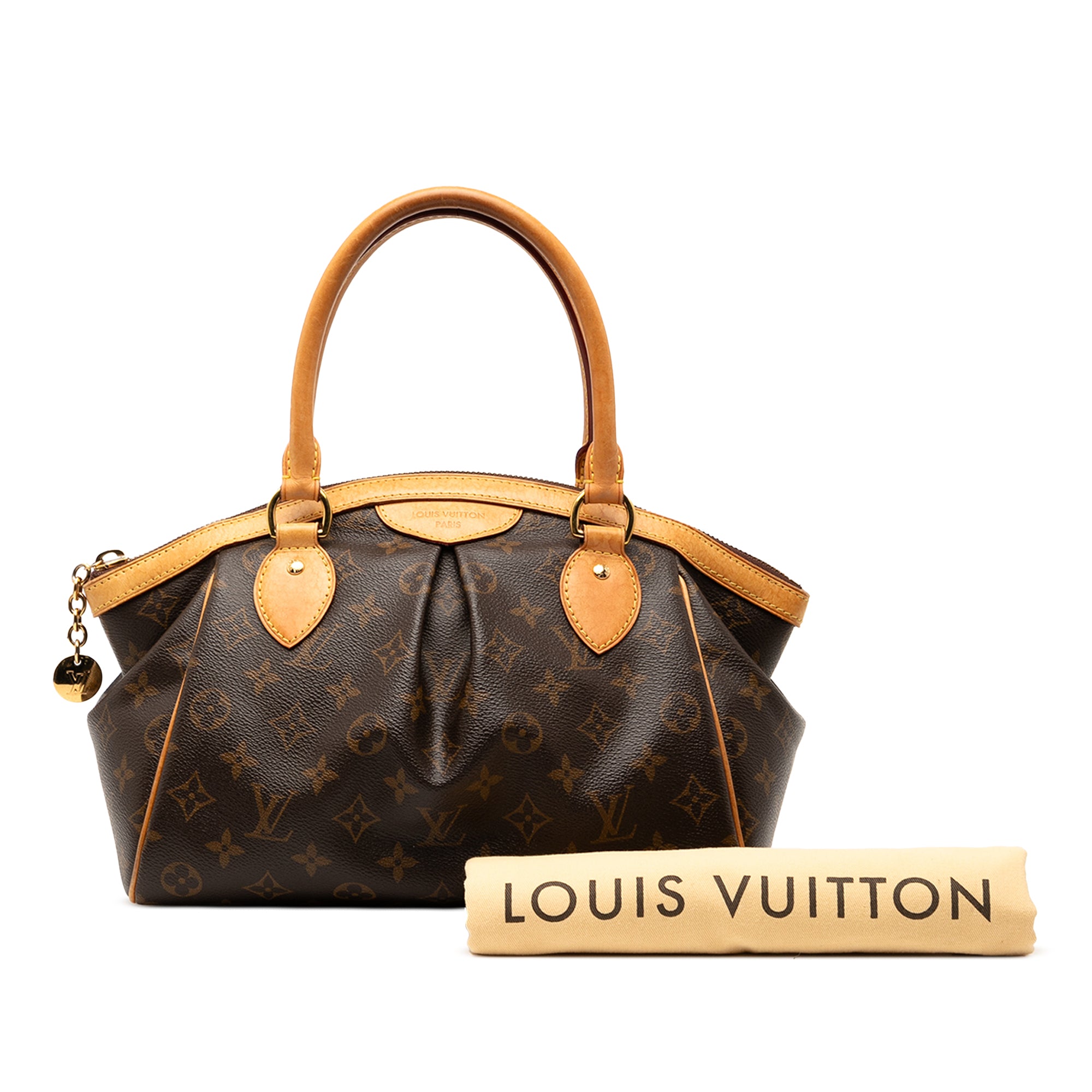 Product Details: Brown Louis Vuitton Monogram Tivoli PM Handbag. The Tivoli PM features a monogram canvas body with vachetta leather trim, rolled vachetta leather handles, a top zip closure, and interior slip pockets. 8.3" L x 11.2" W x 5.5" D, 4.7" drop. Serial number MB4134.