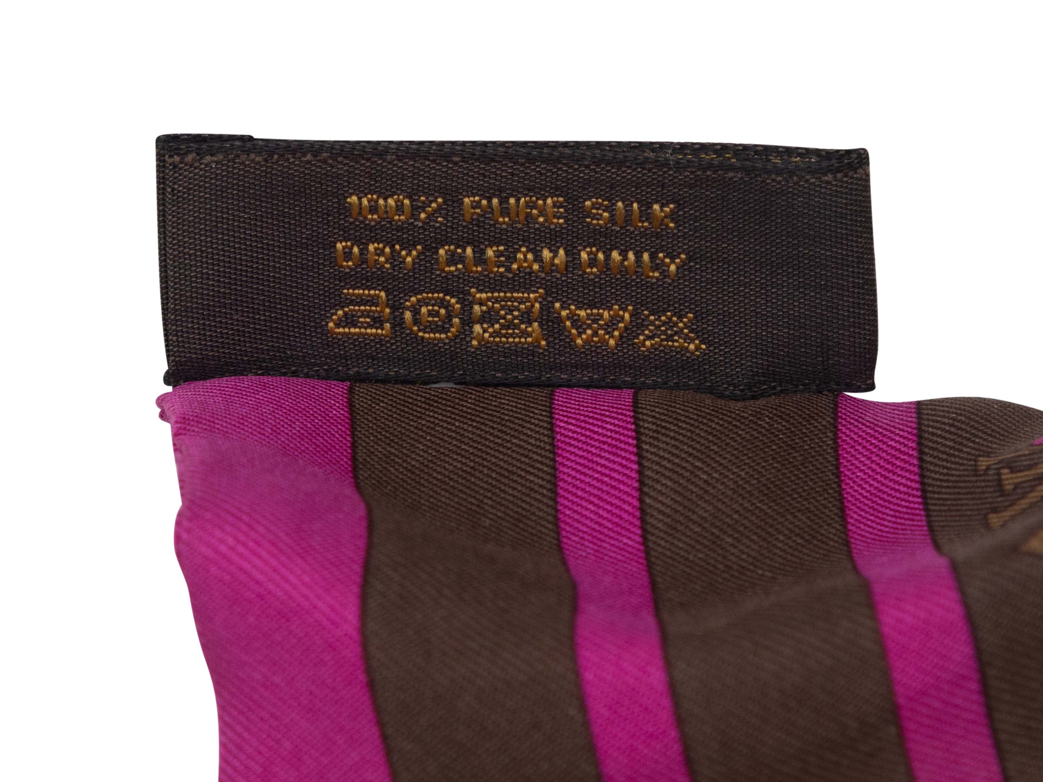 Product Details: Brown and magenta printed silk twille scarf by Louis Vuitton. 2.5" width, 49" length.