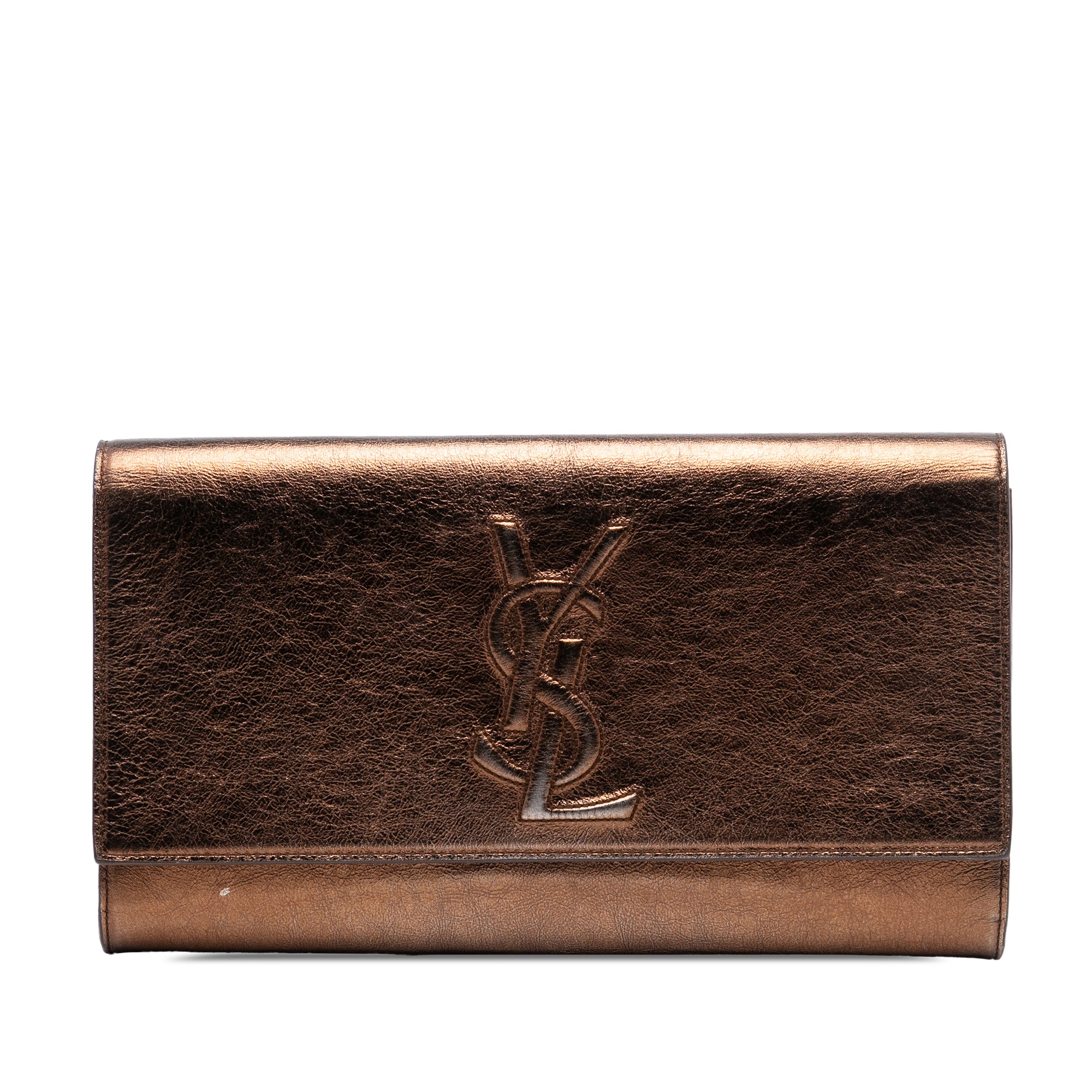 Product Details: Brown Saint Laurent Large Metallic Leather Belle de Jour Clutch. The Belle De Jour clutch bag features a leather body, a flap with magnetic snap closure, and an interior slip pocket. 6.3" L x 11" W x 1.2" D. Serial number ·203855·002020·.