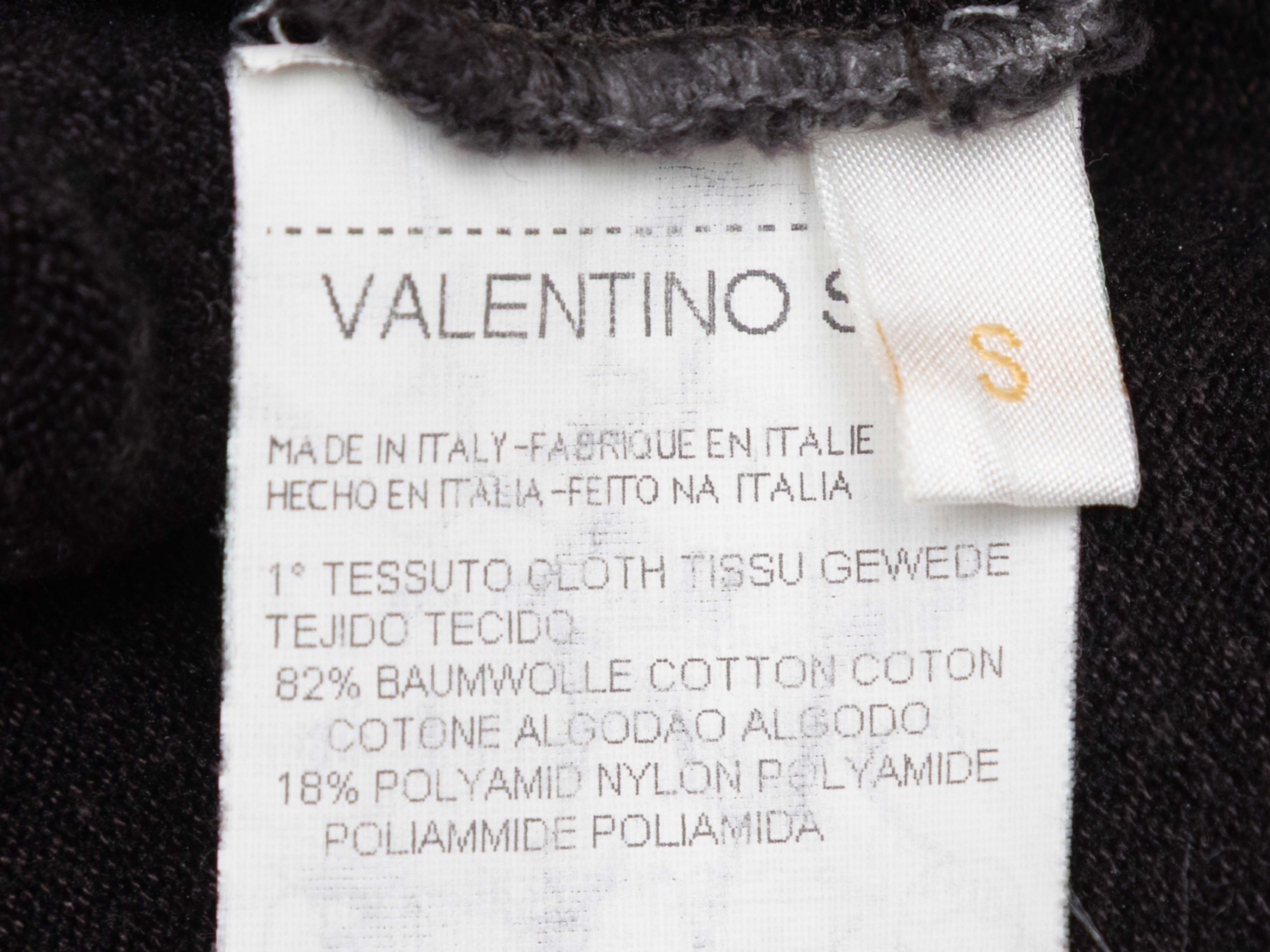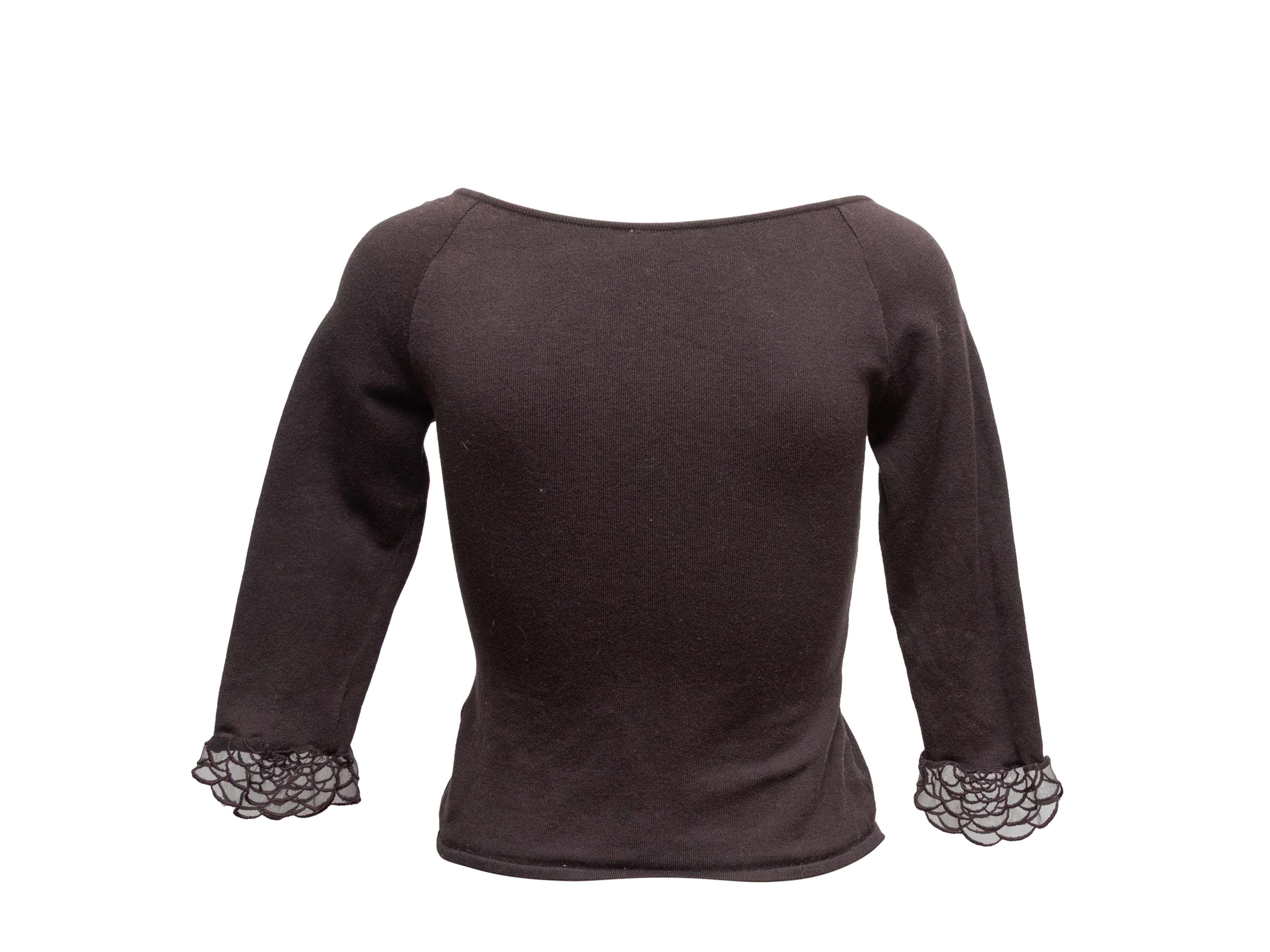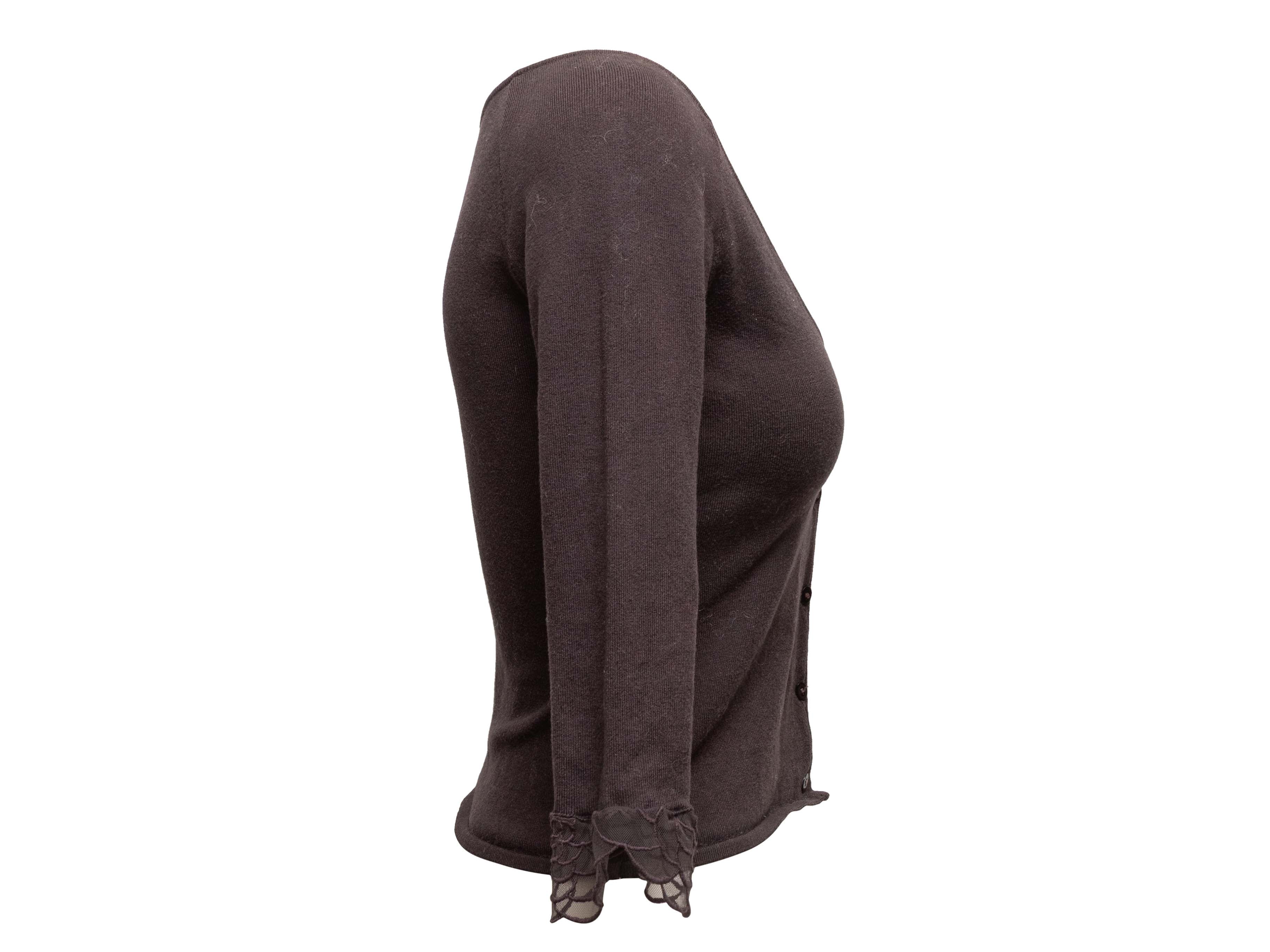 Product Details: Brown cotton cropped V-neck cardigan by Valentino. Mesh trim at three-quarter sleeves. Button closures at center front. 29" bust, 15.5" shoulder width, 18" length.