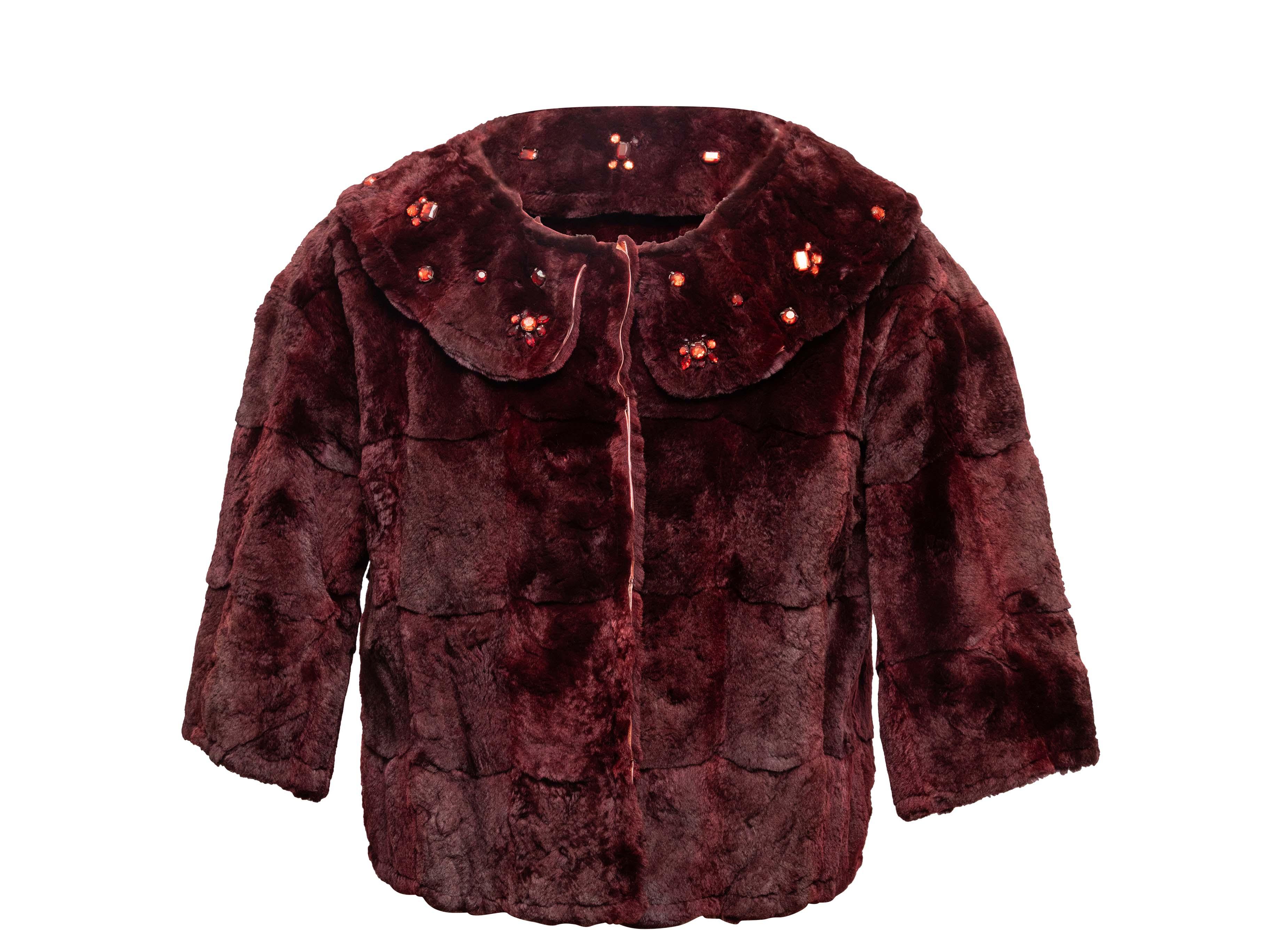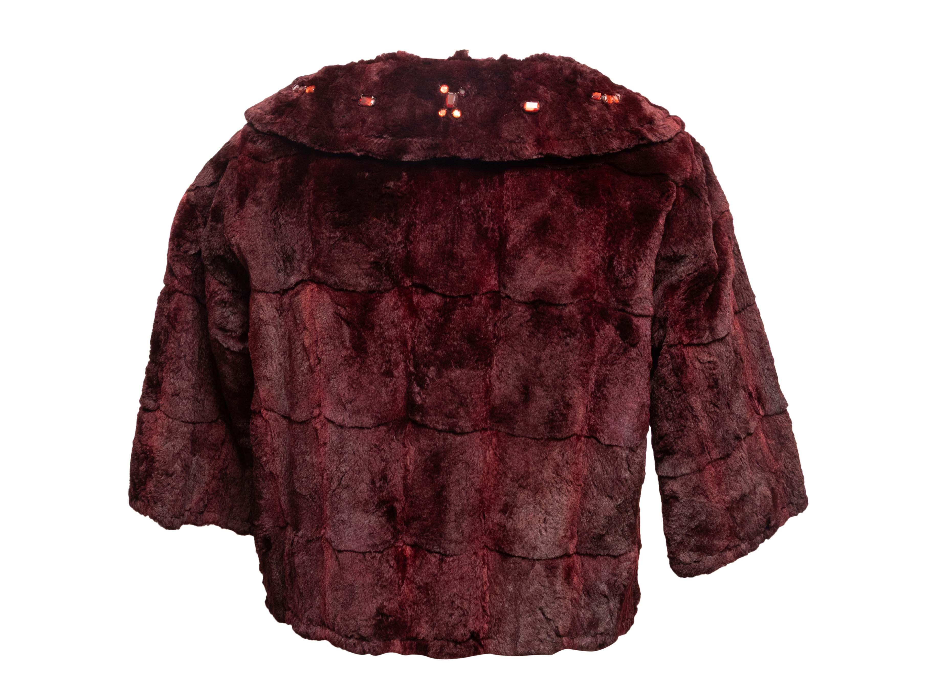 Product Details: Burgundy fur evening jacket by Maurizio Pecoraro. Crystal-embellished Peter Pan collar. Cropped sleeves. 36" bust, 19" shoulder width, 13" sleeve length, 20.5" length.