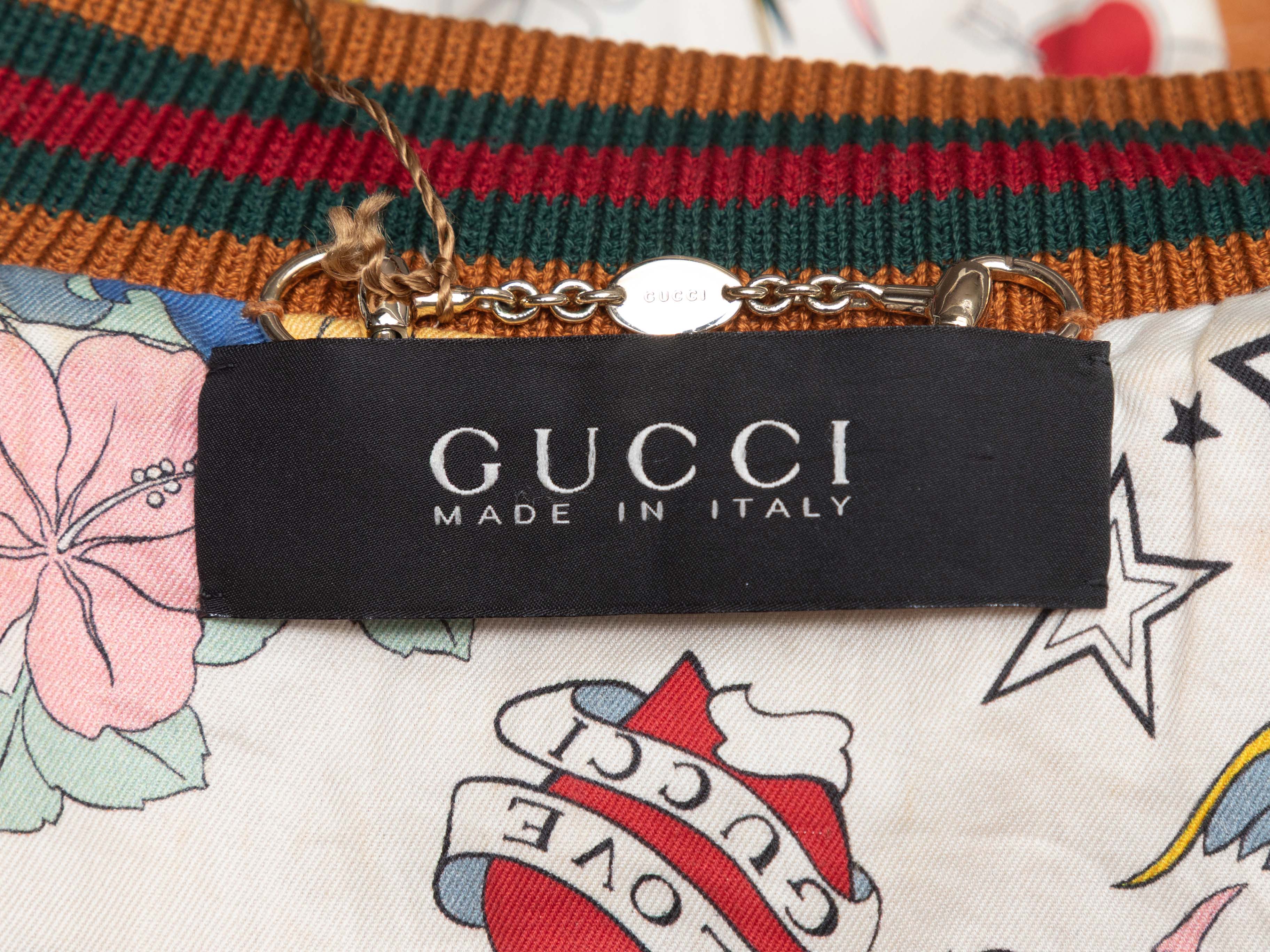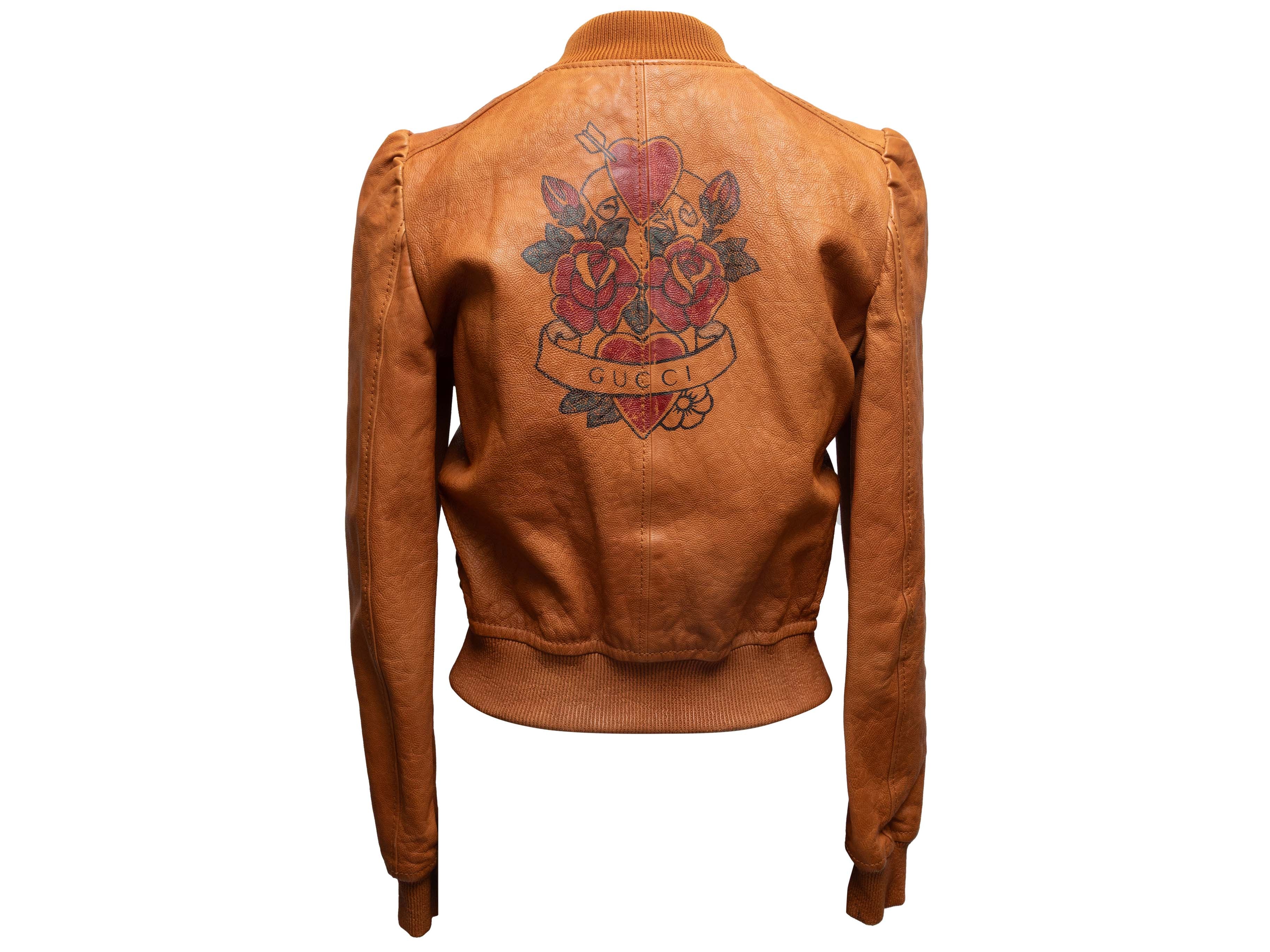 Product Details: Cognac cropped leather jacket by Gucci. Rib knit trim. Tattoo graphic print at back. Four front pockets. Zip closure at center front. 32" bust, 17" shoulder width, 25" sleeve length, 21" length.