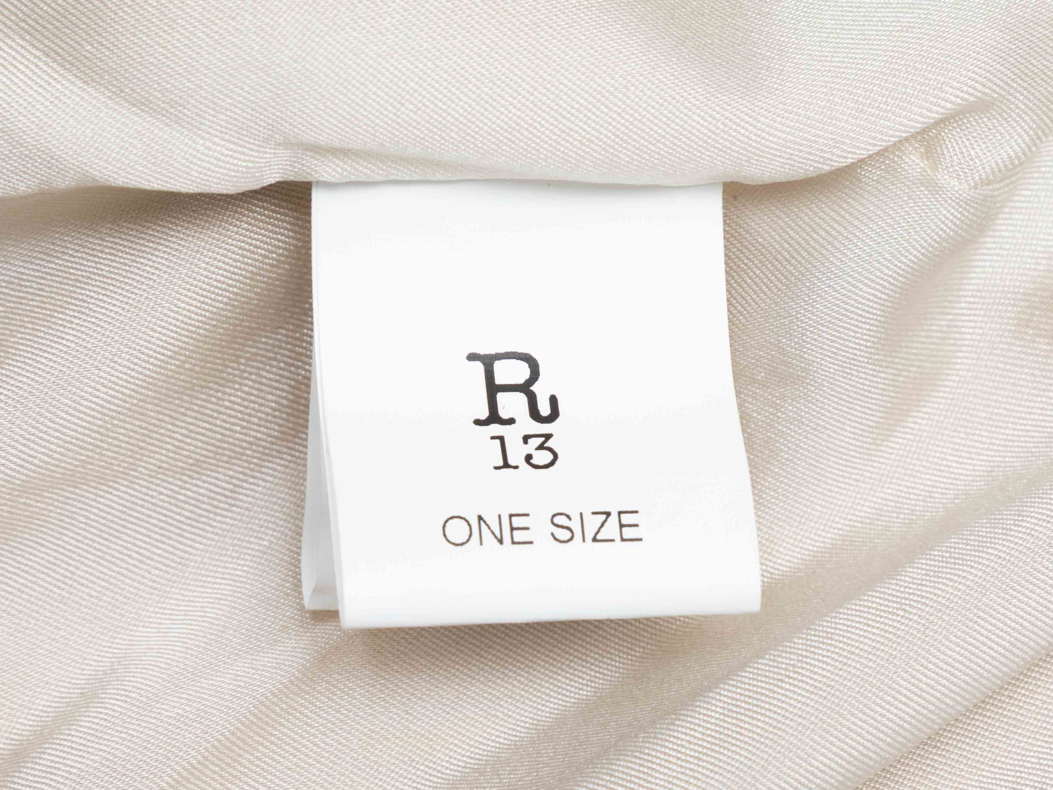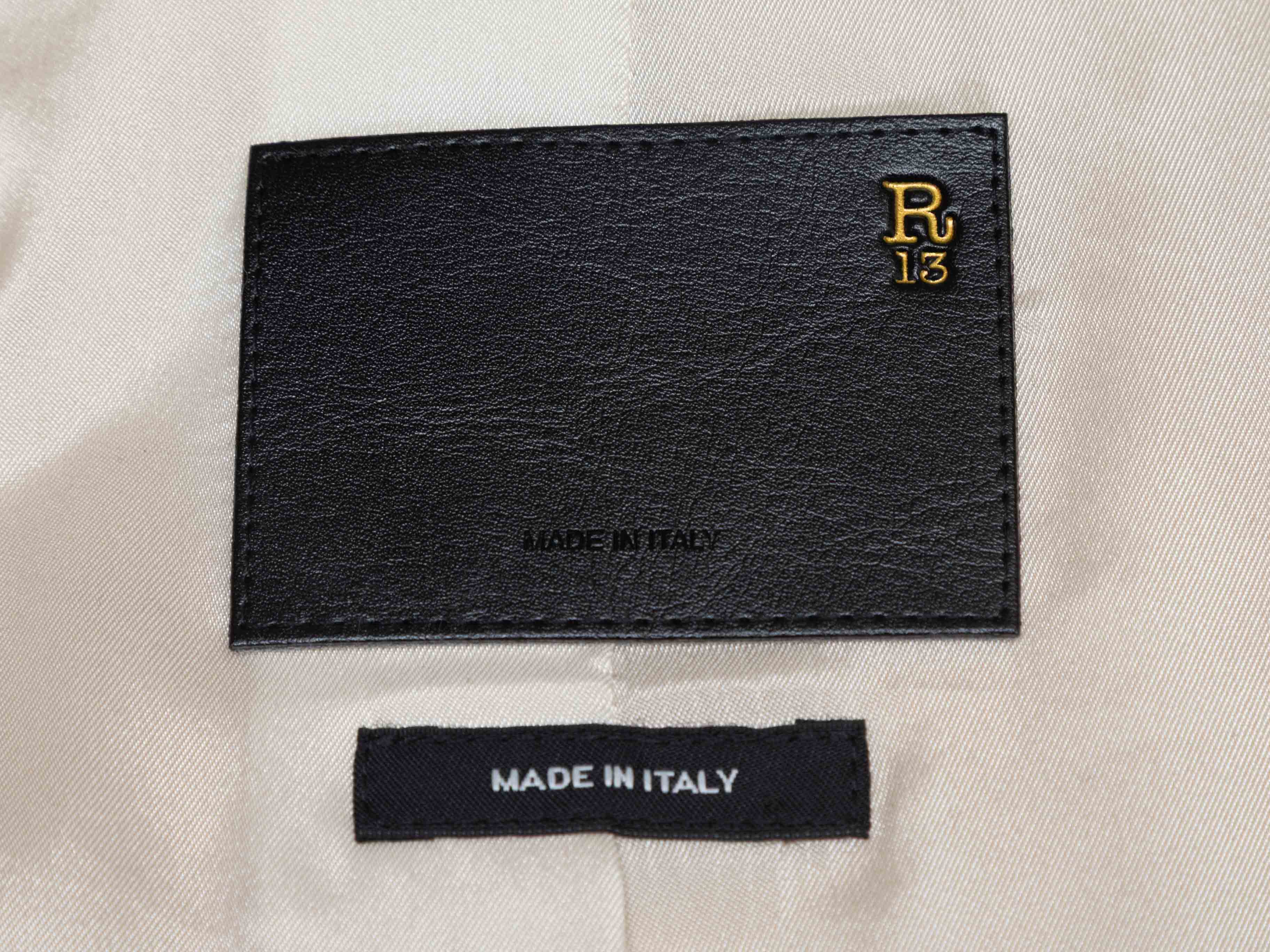 Product Details: Cream oversized fringe leather jacket by R13. Pointed collar. Dual hip pockets. Front closures. 50" bust, 17" shoulder width, 20" sleeve length, 30" length.
