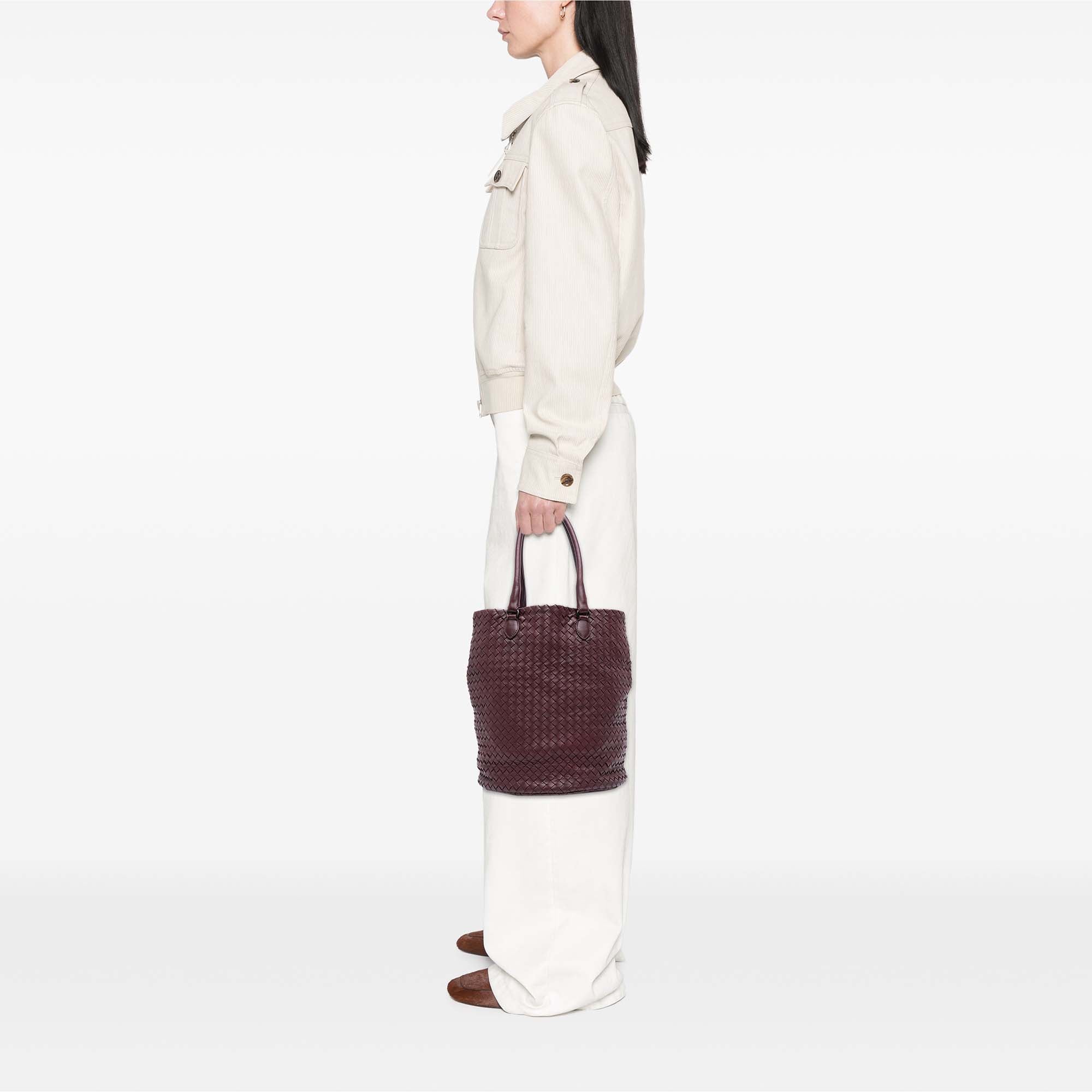 Product Details: Grape Bottega Veneta Nappa Intrecciato Bucket Bag. This bucket bag features a woven leather body, rolled leather handles, an open top, and interior zip and slip pockets. 13" L x 10.6" W x 10.6" D, 6.7" drop. Serial number 226344 V0016 6167.