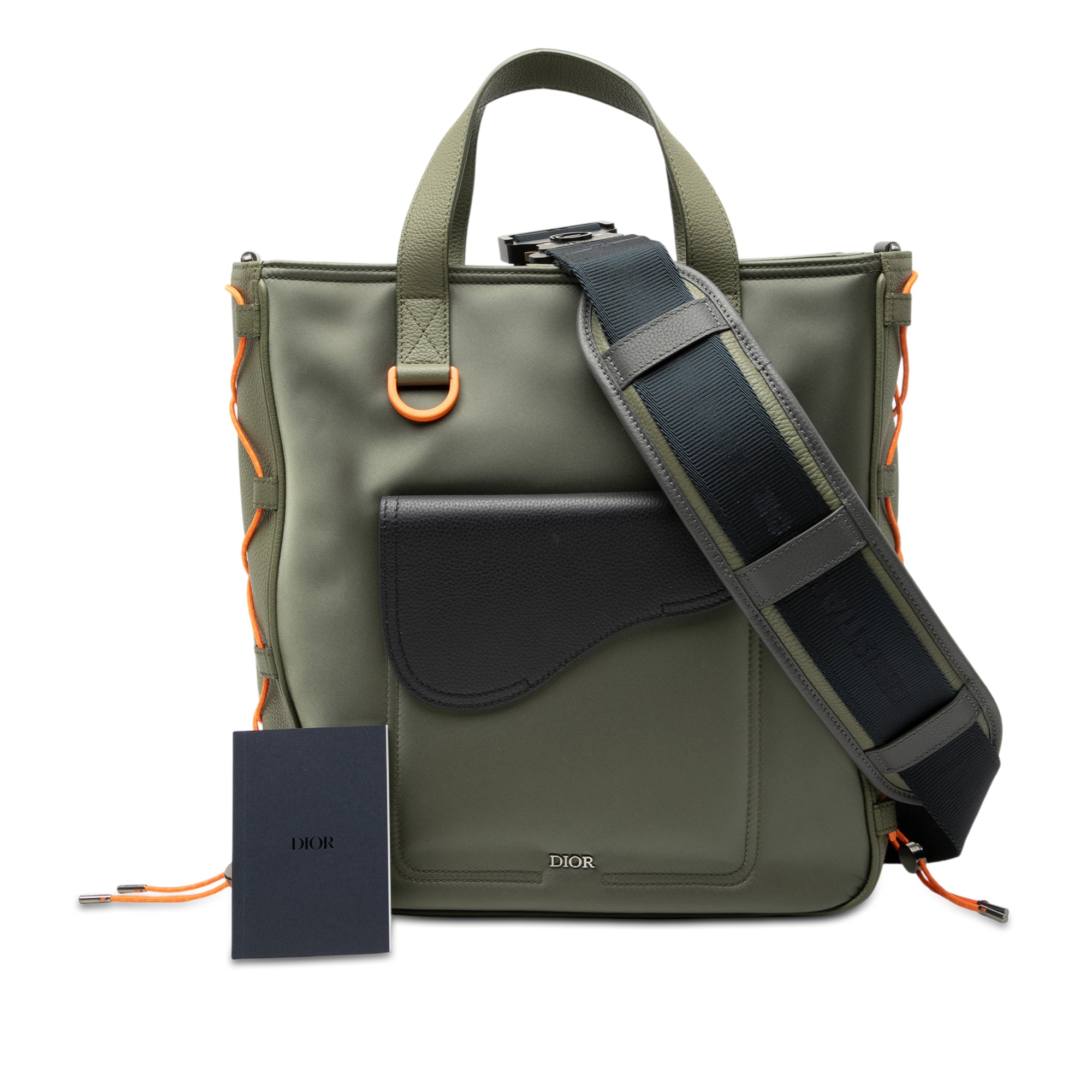 Product Details: Green Dior Sacai Nylon and Leather Saddle Tote Satchel. This satchel features a nylon body with leather trim, flat leather handles, an adjustable flat shoulder strap, an open top with magnetic snap closure, an exterior flap pocket, and an interior zip pocket. 11.4" L x 11" W x 3.9" D, 4.3" drop. Serial number 11 BO 0291.