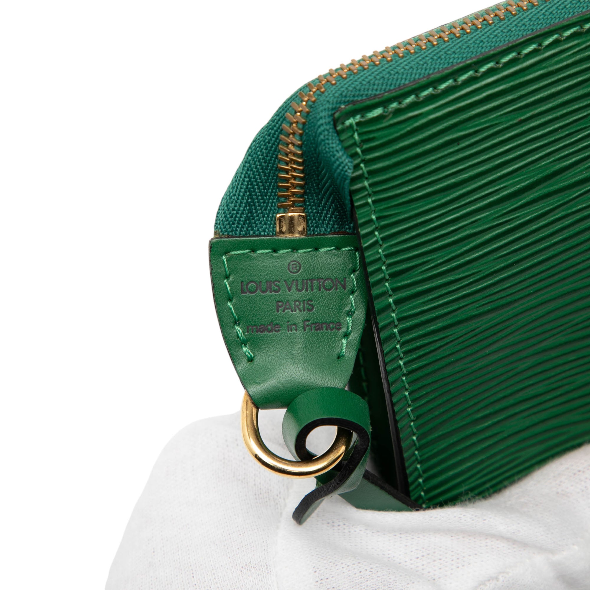 Product Details: Green Louis Vuitton Epi Pochette Accessoires Shoulder Bag. The Pochette Accessoires features an epi leather body, a flat shoulder strap, and a top zip closure. 4.3" L x 8.3" W x 1.2" D. Serial number AR1829.