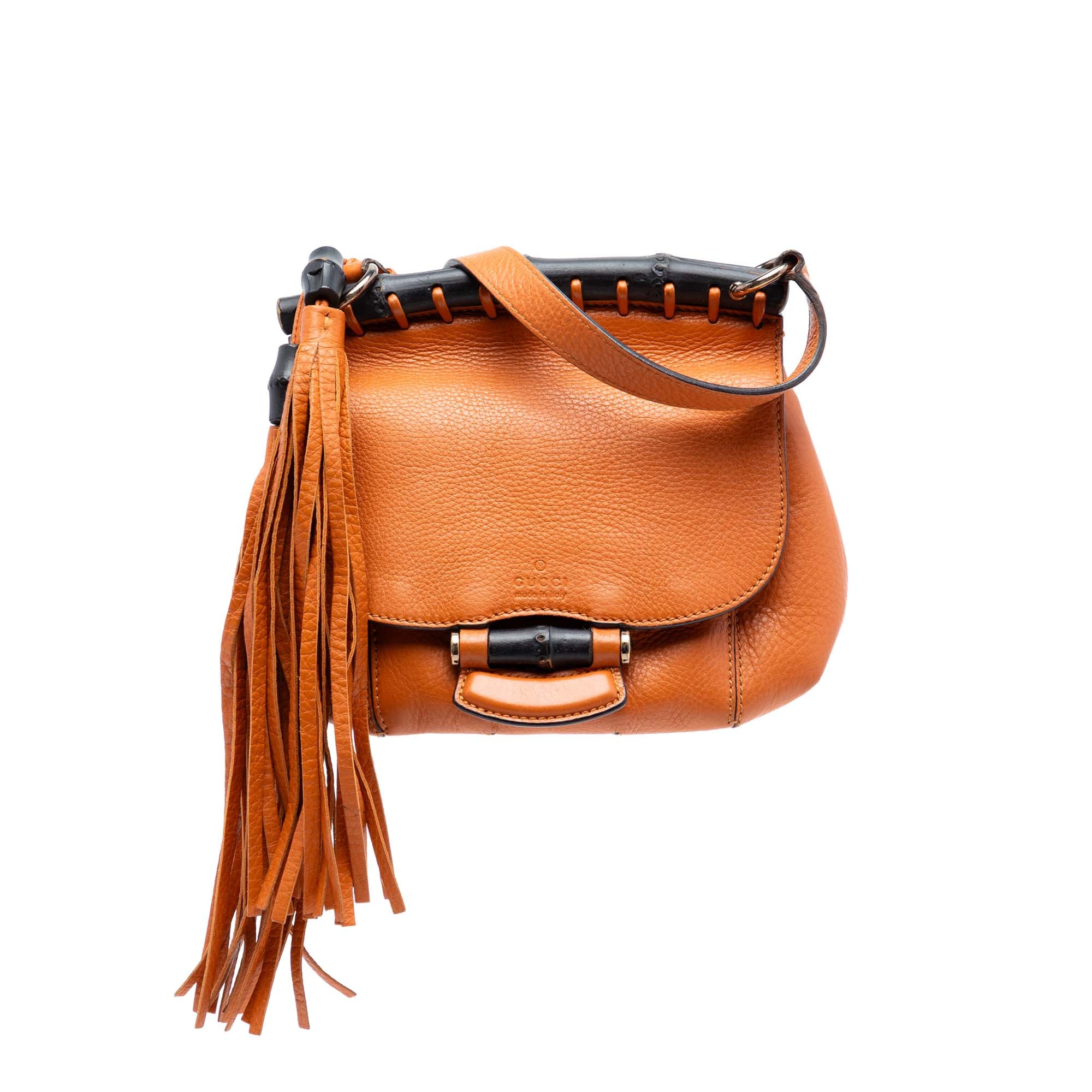 Product Details: Orange Gucci Small Leather Bamboo Nouveau Fringe Crossbody. The Nouveau Fringe features a leather body, a flat leather strap, a fringe detail, a front flap with bamboo closure, and an interior zip pocket. 7.9" L x 9.1" W x 1.2" D. Serial number 347104.520981.