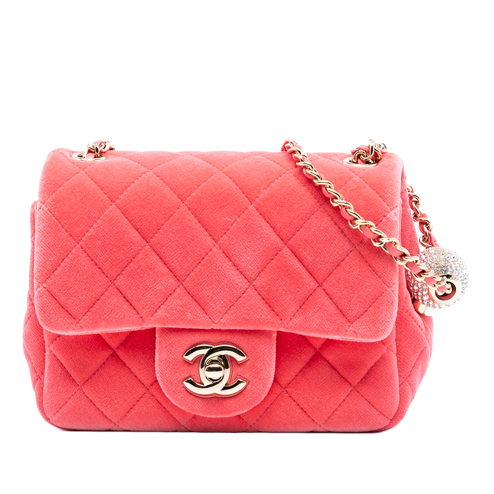 Product Details: Pink Chanel Mini Square Classic Velvet Pearl Crush Single Flap Crossbody Bag. This crossbody bag features a quilted lambskin leather body, a leather woven chain link shoulder strap with ball detail, a front flap with CC turn-lock closure, an exterior back slip pocket, and interior zip and slip pockets. 5.3" L x 6.7" W x 2.8" D. Serial number 30477665.