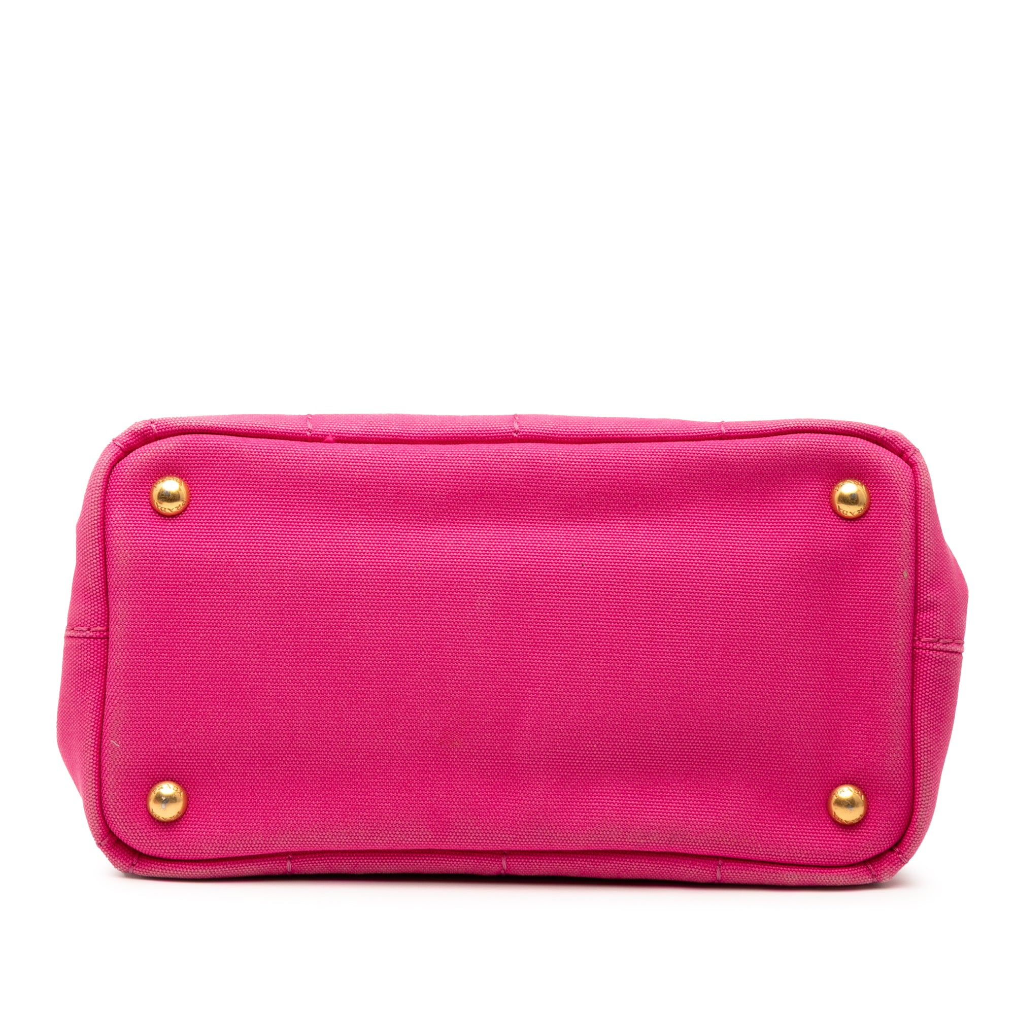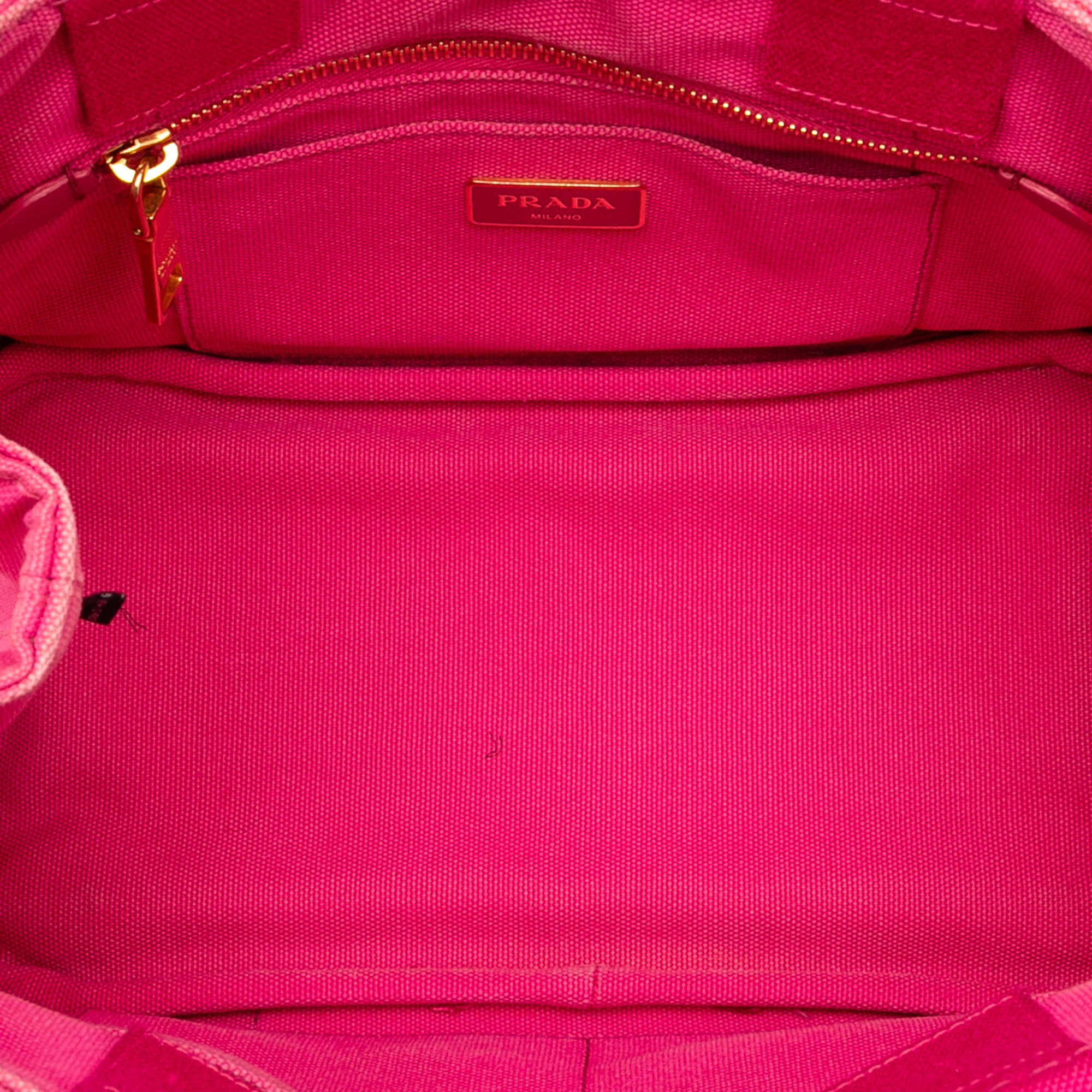 Product Details: Pink Prada Small Canvas Canapa Logo Satchel. This satchel features a canvas body, rolled canvas handles, a detachable flat canvas strap, an open top with side snap closures, and interior zip and slip pockets. 7.5" L x 11" W x 5.9" D, 3.5" drop.