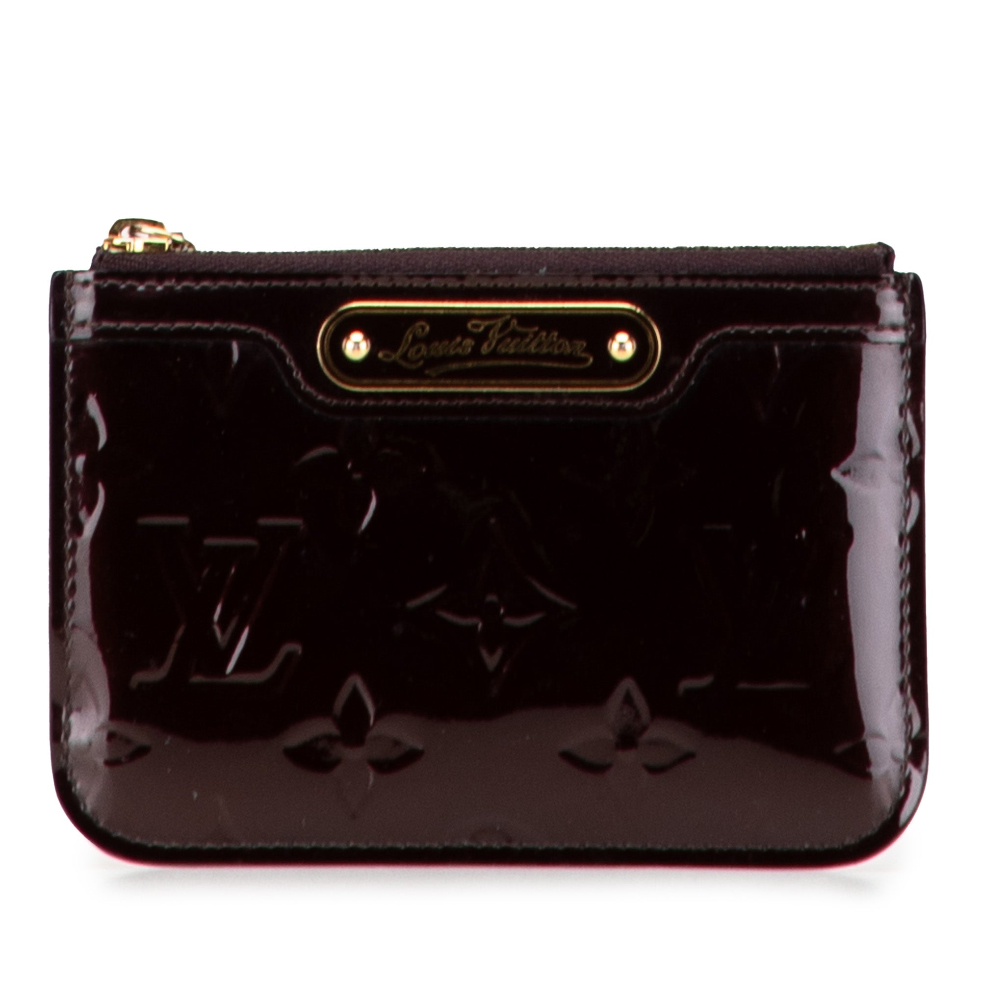 Product Details: Purple Louis Vuitton Monogram Vernis Key Pouch. This key pouch features a monogram vernis body, a top zip closure, an exterior slip pocket and a gold-tone lobster clasp hook. 3.5" L x 5.1" W x 0.2" D. Serial number SN1144.