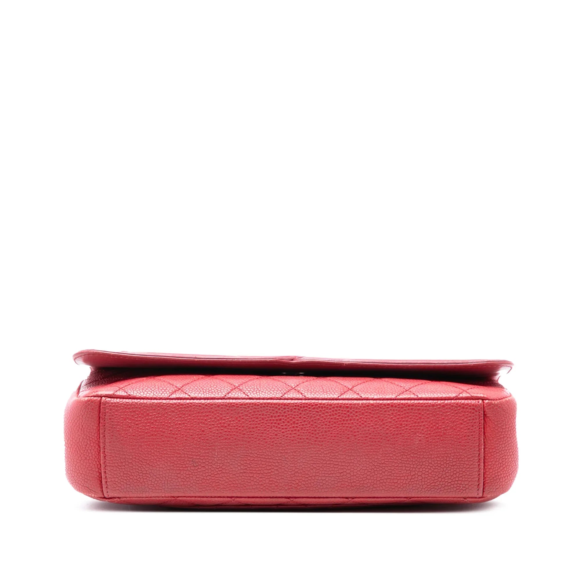Product Details: Red Chanel Medium Quilted Caviar CC Filigree Flap Shoulder Bag. The CC Filigree Flap features a quilted caviar leather body, a leather wove chain shoulder strap with leather guard, a front flap with magnetic snap closure, and interior zip and slip pockets. 6.7" L x 9.8" W x 2.4" D. Serial number 22466918.