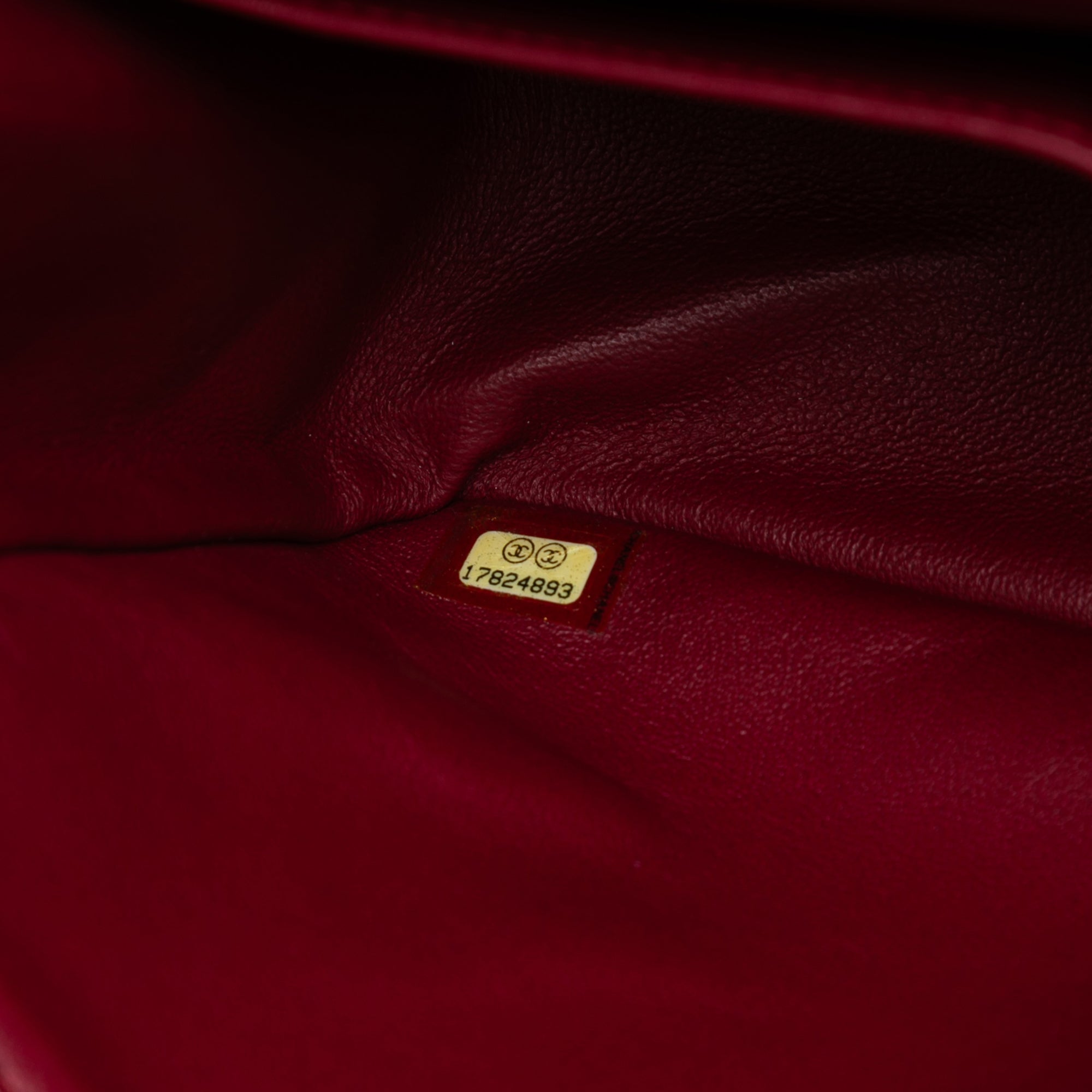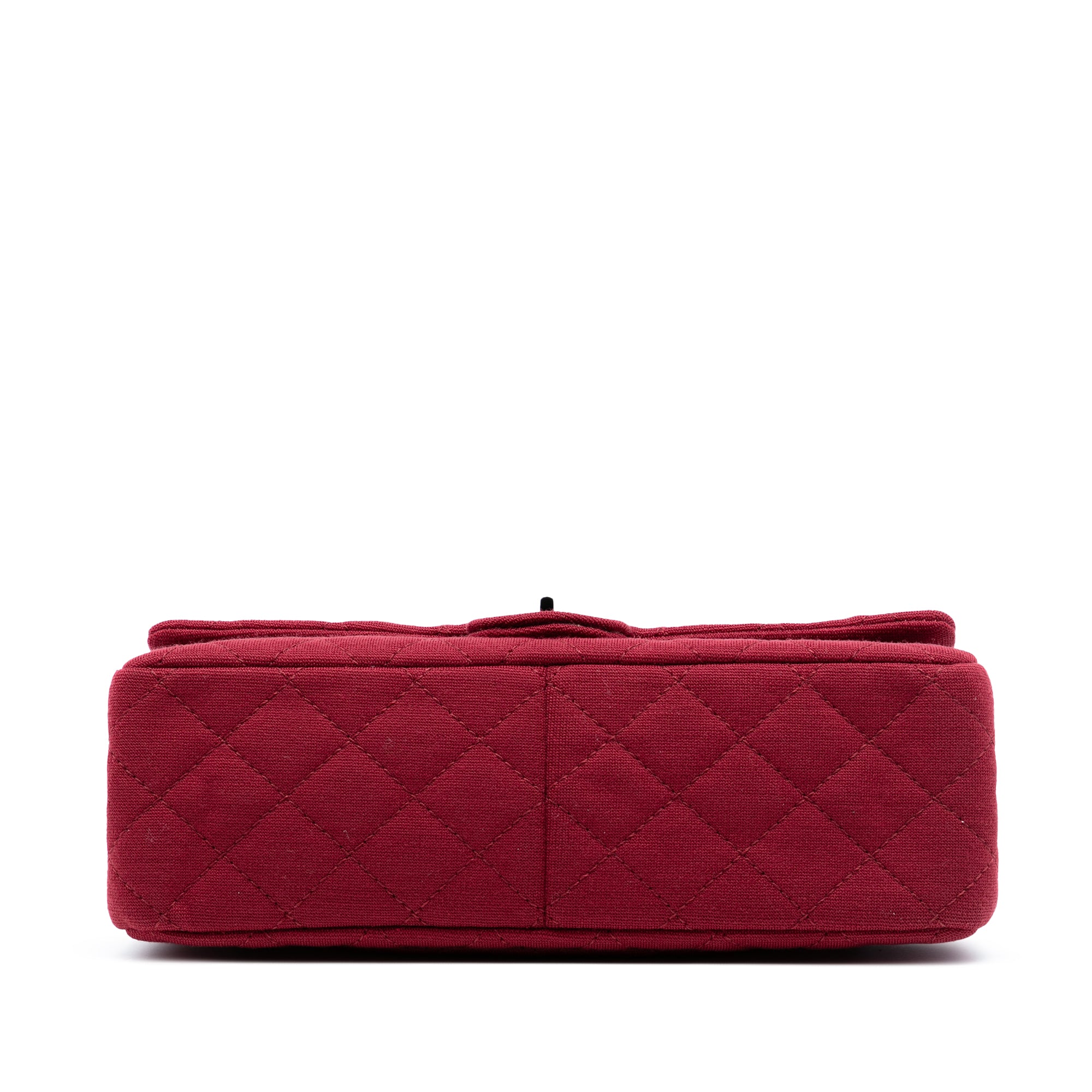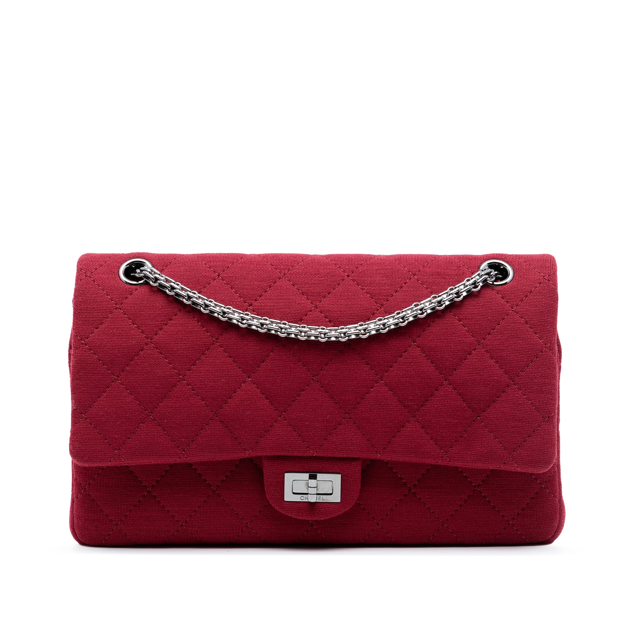 Product Details: Red Chanel Reissue 2.55 Quilted Jersey Double Flap 226 Shoulder Bag. This shoulder bag features a quilted jersey body, chain link shoulder straps, double front flaps with twist-lock closure, an exterior back slip pocket, and interior zip and slip pockets. 7.1" L x 11" W x 3.3" D. Serial number 17824893.