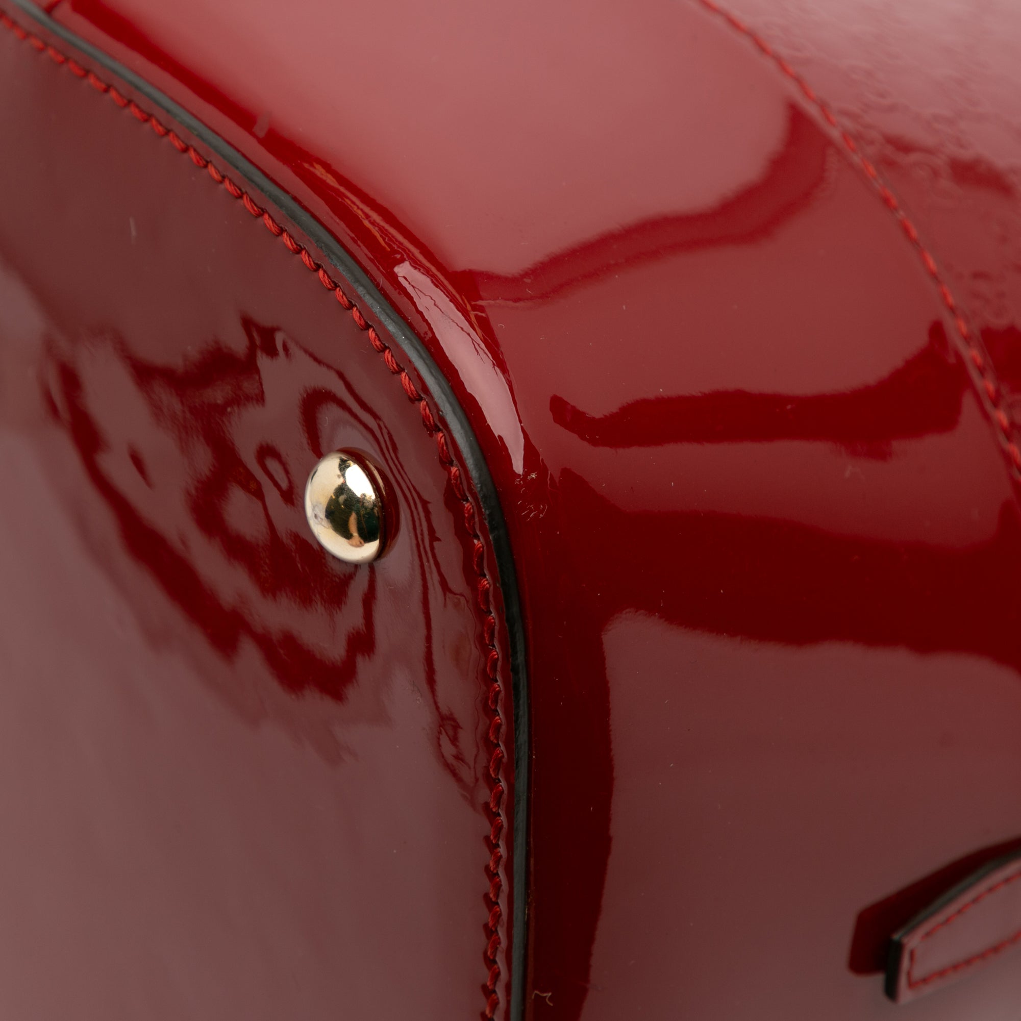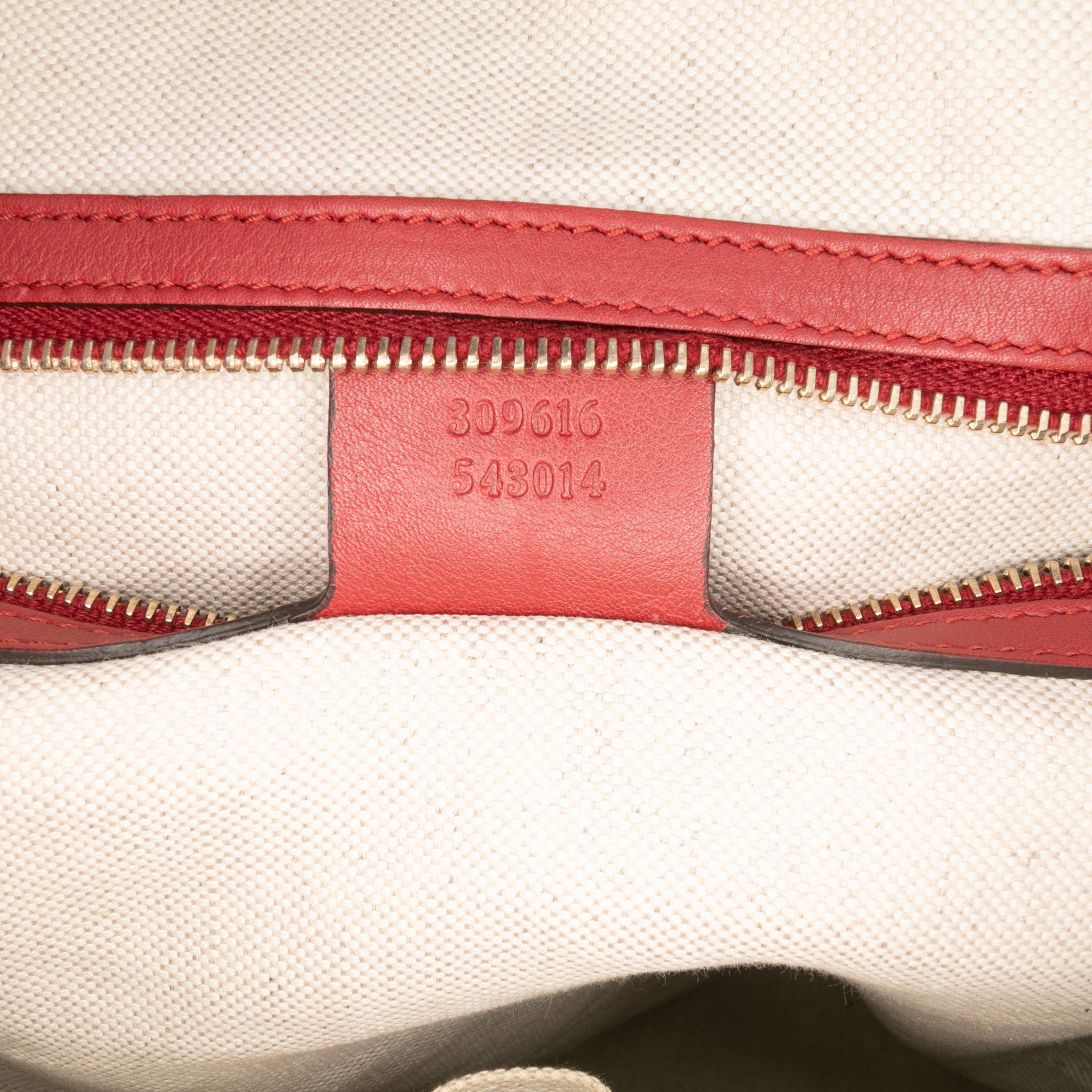 Product Details: Red Gucci Large Microguccissima Patent Nice Dome Top Handle Bag Satchel. This tote features a patent leather body with leather trim, flat leather handles, a detachable flat leather strap, dual top zip closure, and interior slip and zip pockets. 12.6" L x 15.6" W x 6.9" D, 4.7" drop. Serial number 309616 543014.