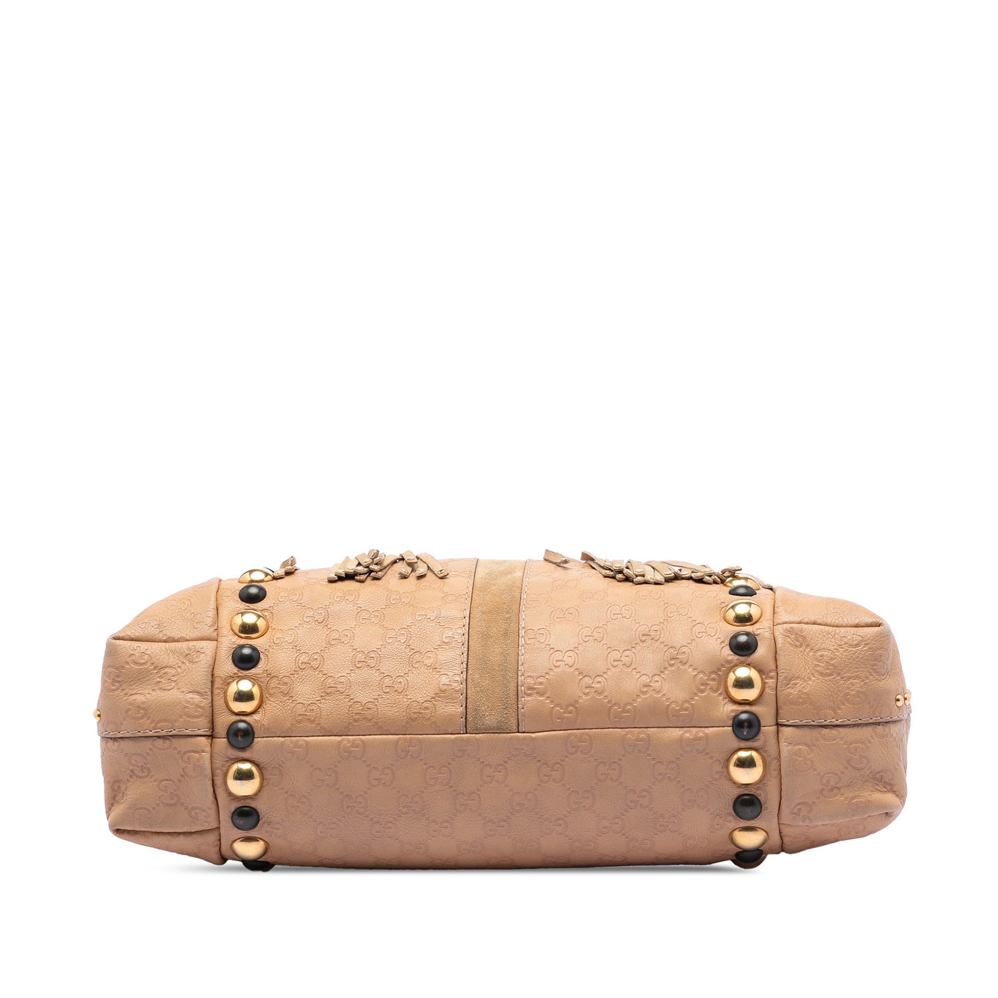 Product Details: Tan Gucci Guccissima Babouska Fringe Tote. This tote bag features an embossed leather body with fringe and stud details, rolled leather handles, an open top with magnetic closure, and interior zip and slip pockets. 11.6" L x 17.7" W x 4.3" D, 6.3" drop. Serial number 207301 502752.