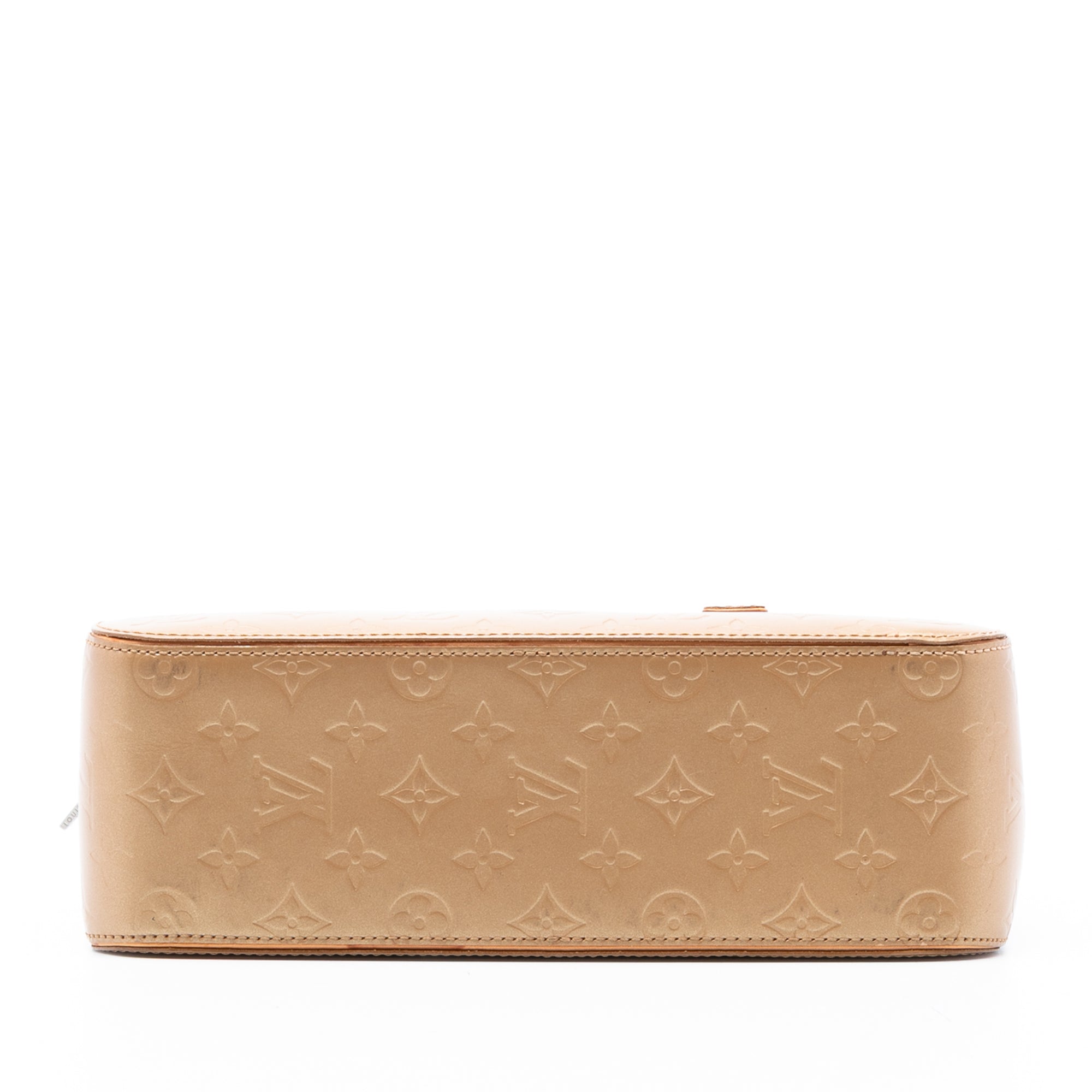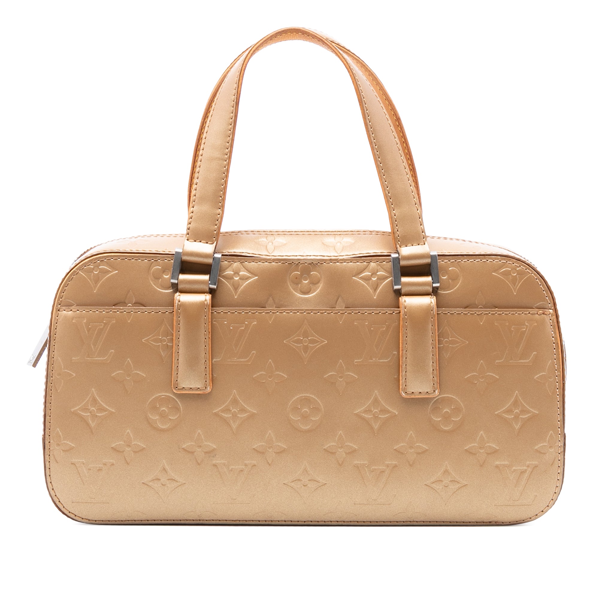 Product Details: Tan Louis Vuitton Monogram Mat Shelton Handbag. The Shelton features a monogram mat leather body, flat leather handles, a top zip closure, an exterior slip pocket, and interior slip pockets. 6.3" L x 11.4" W x 3.5" D, 5.1" drop. Serial number TH1003.