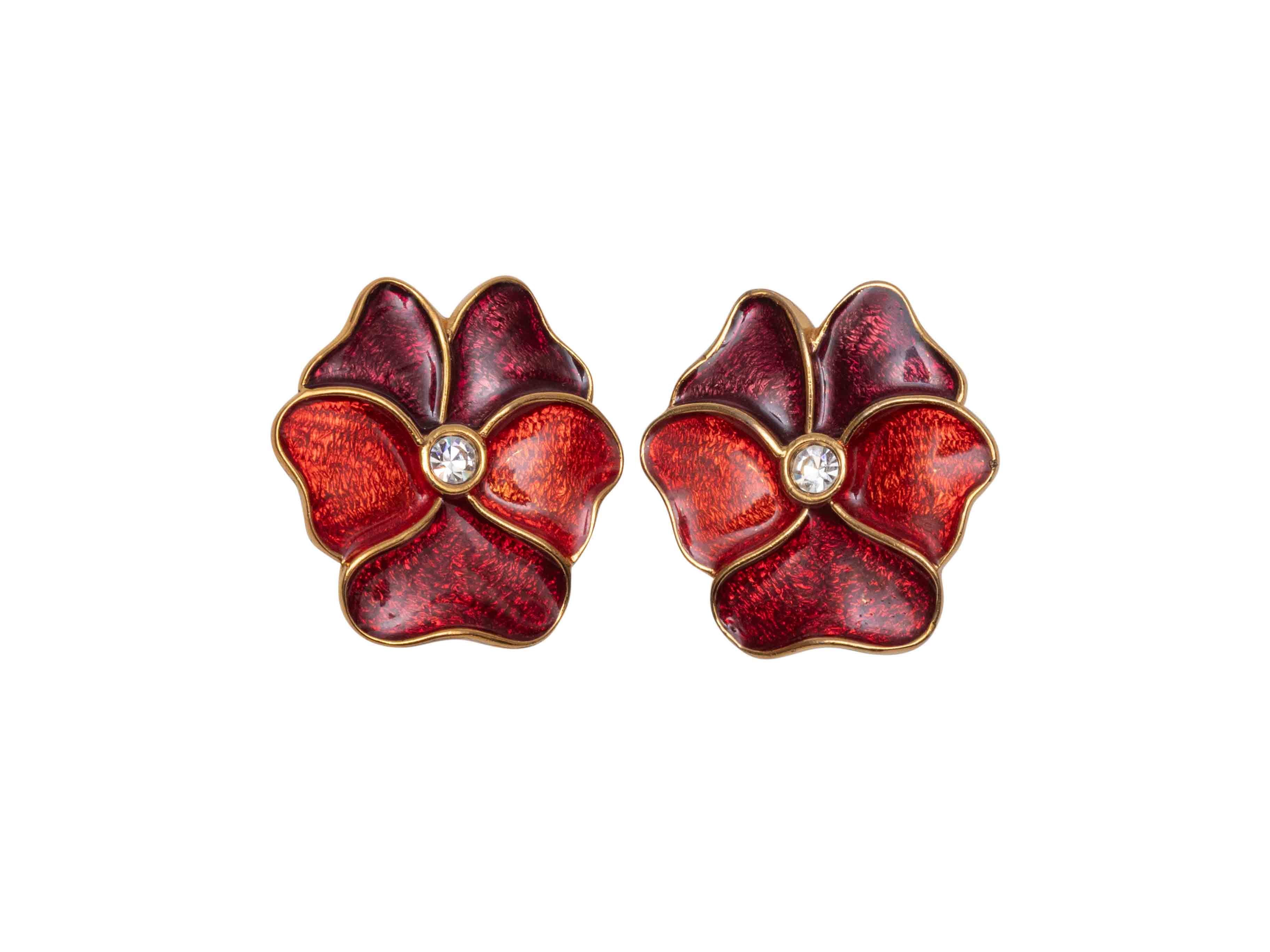 Product Details: Vintage red enamel and gold-tone metal floral clip-on earrings by Yves Saint Laurent. 1.5" width, 1.5" length.