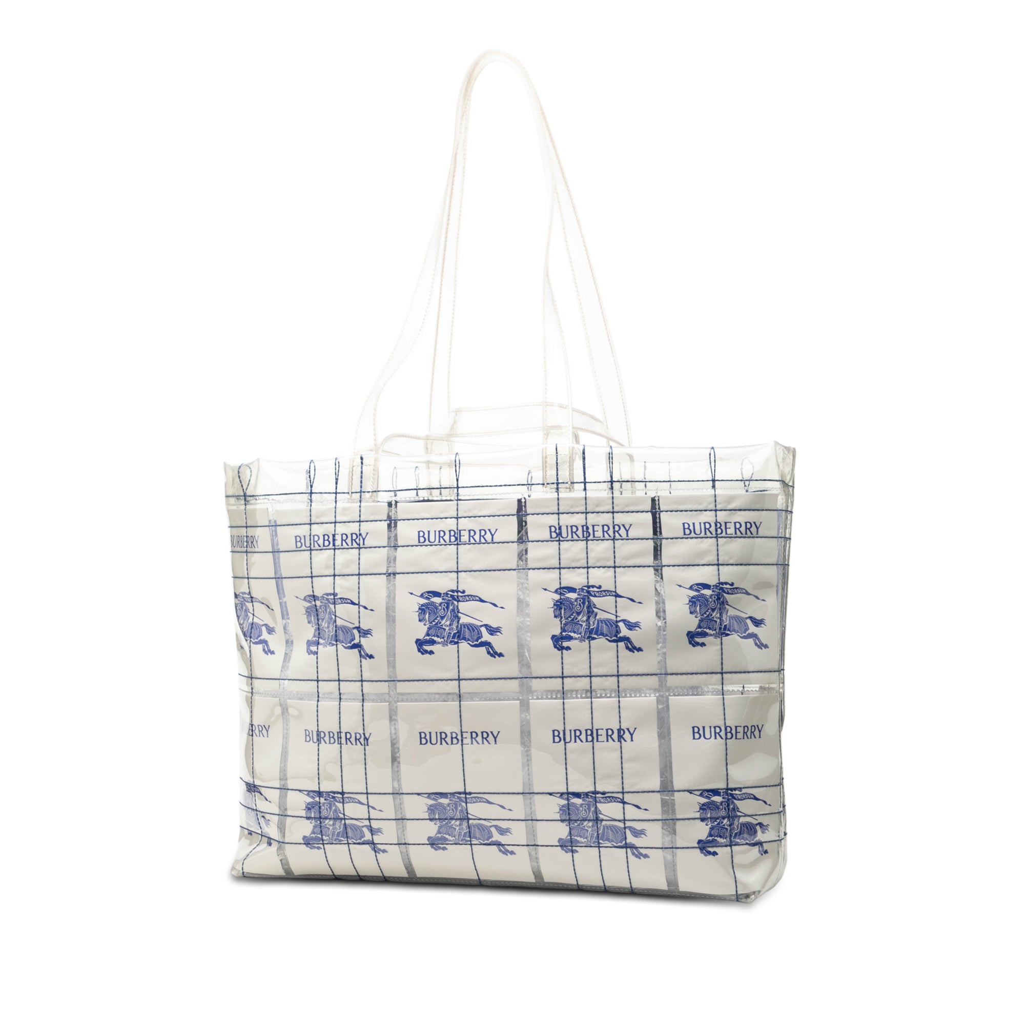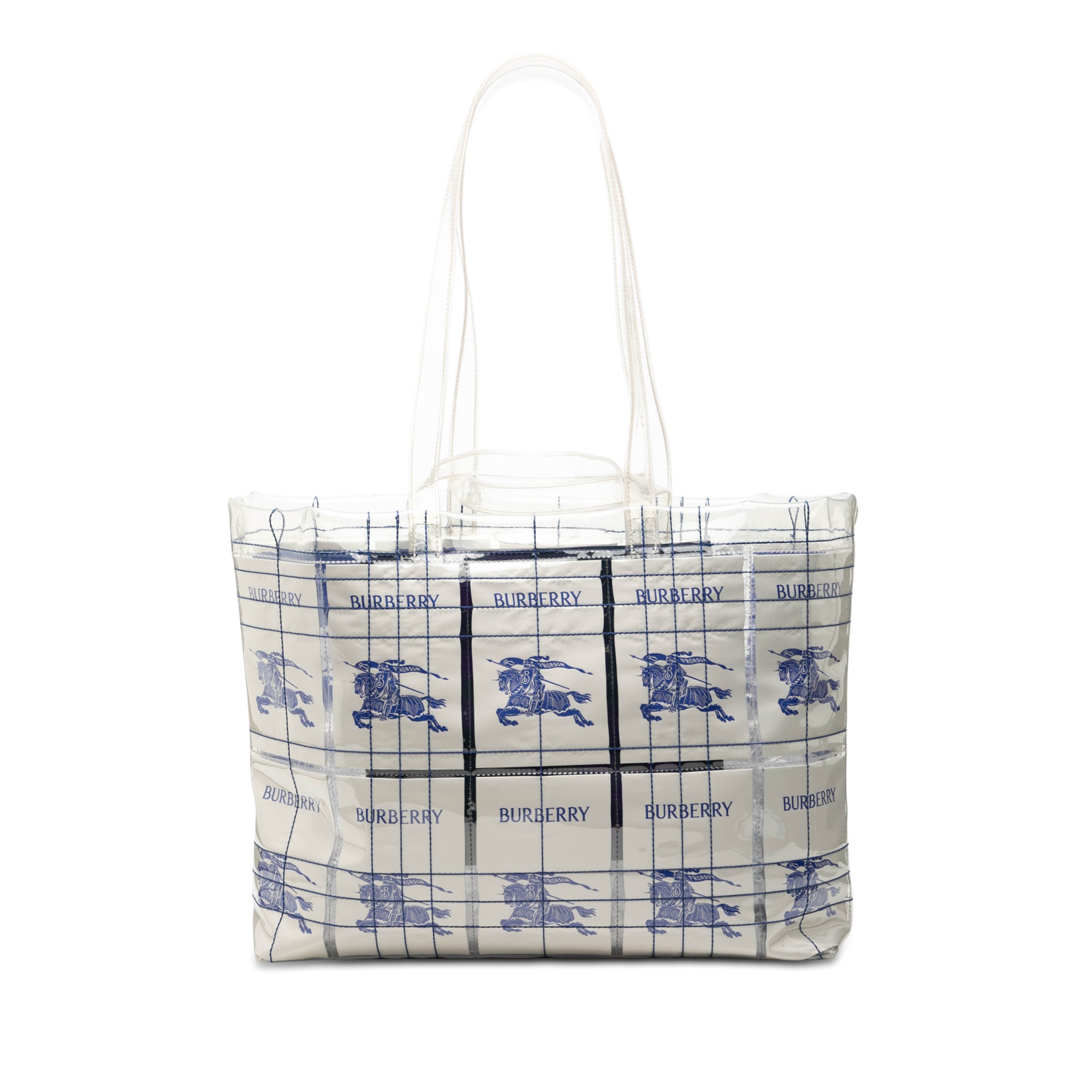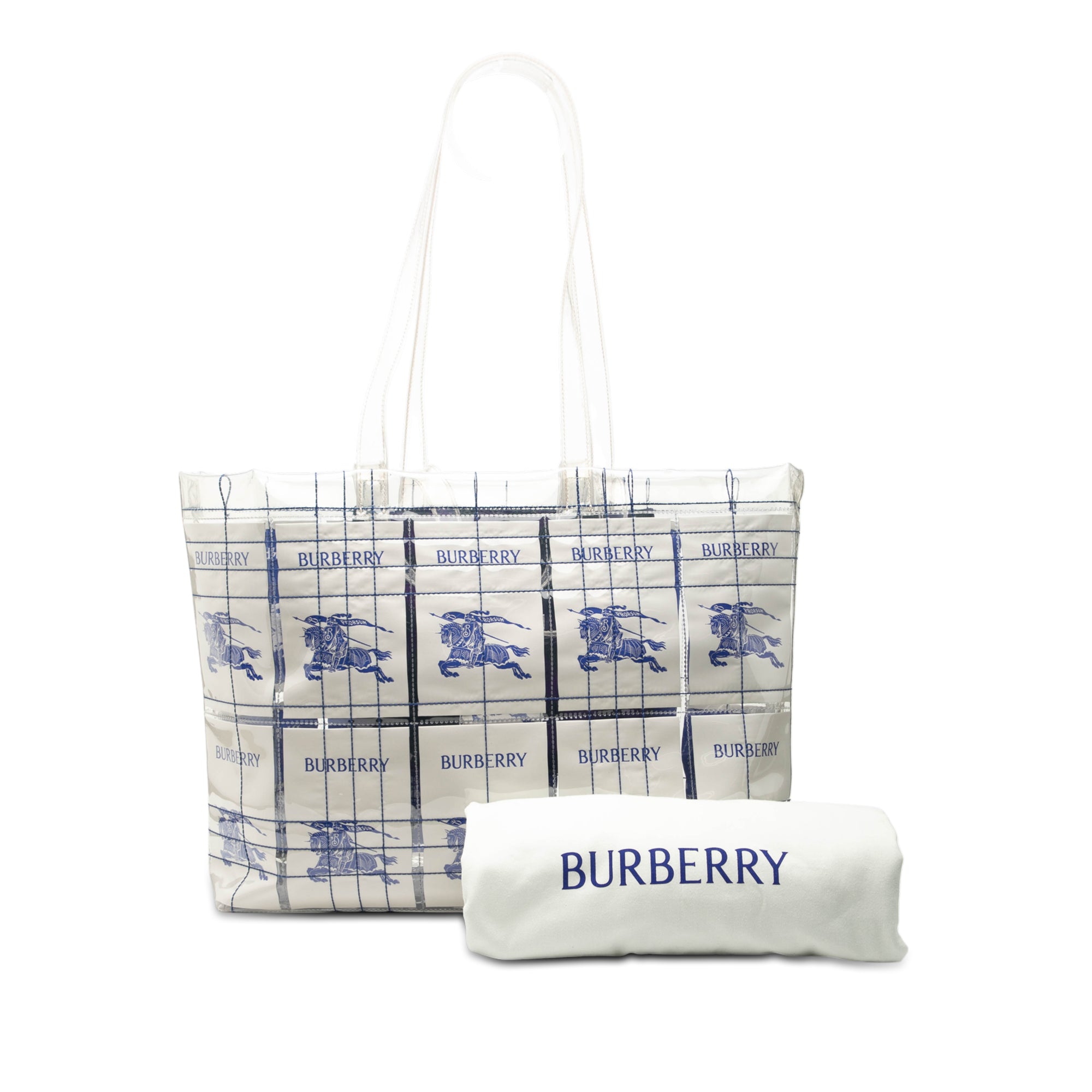 Product Details: White Burberry Polyurethane Transparent EKD Label Tote Satchel. This tote bag features a polyurethane body, flat handles, flat straps, an open top with magnetic snap closure, and an interior zip pocket. 14.2" L x 17.7" W x 5.5" D, 7.5" drop.