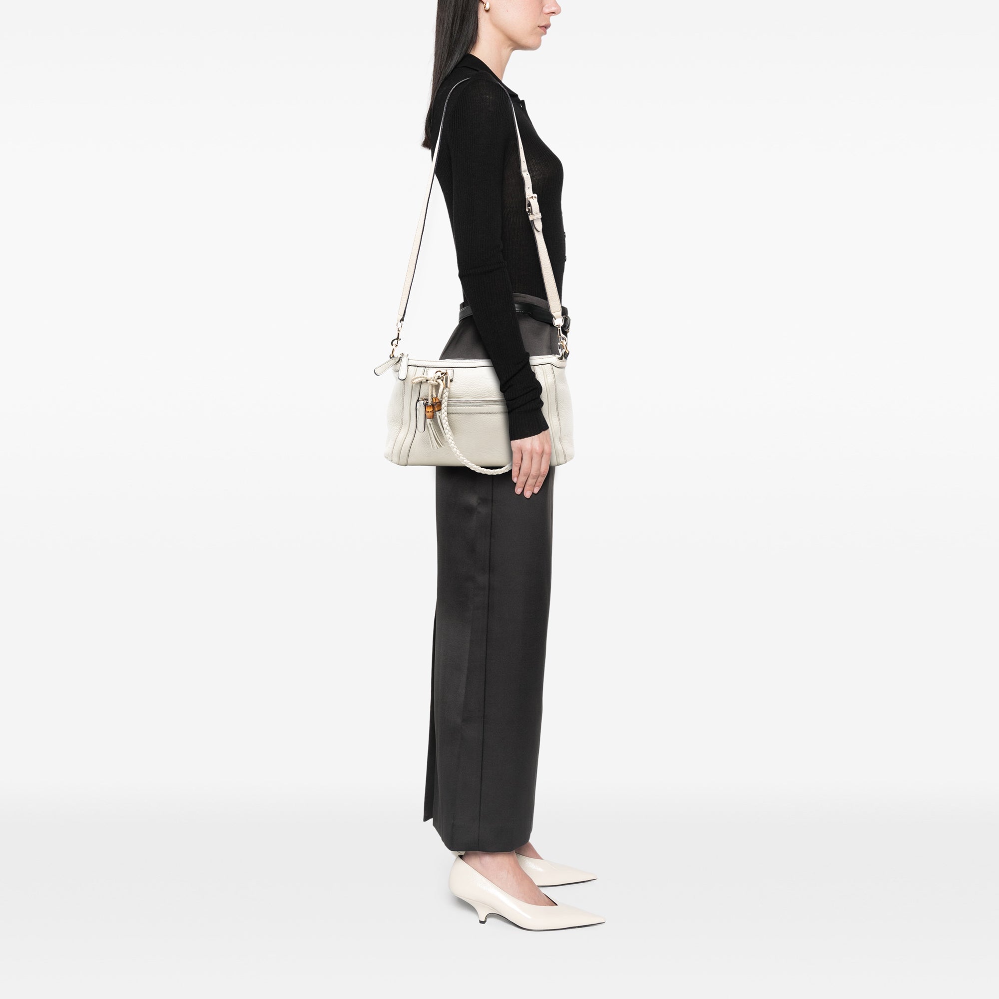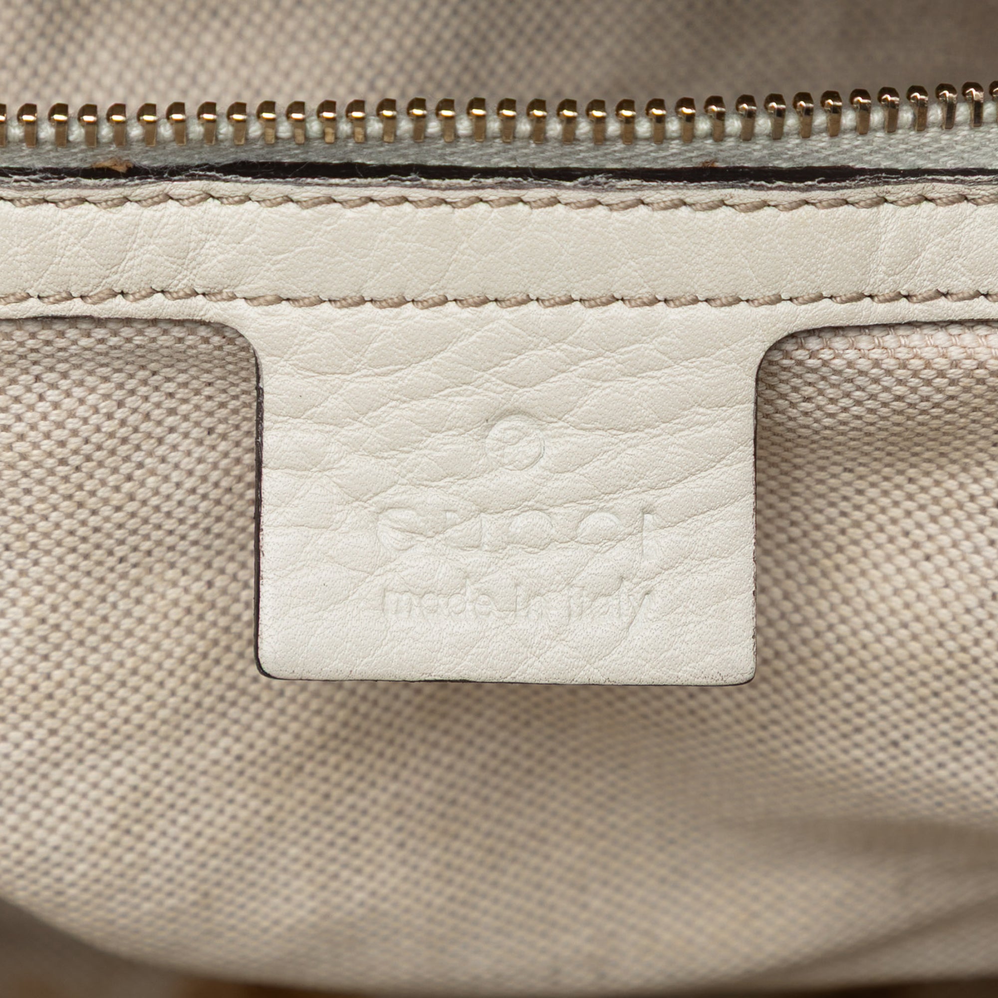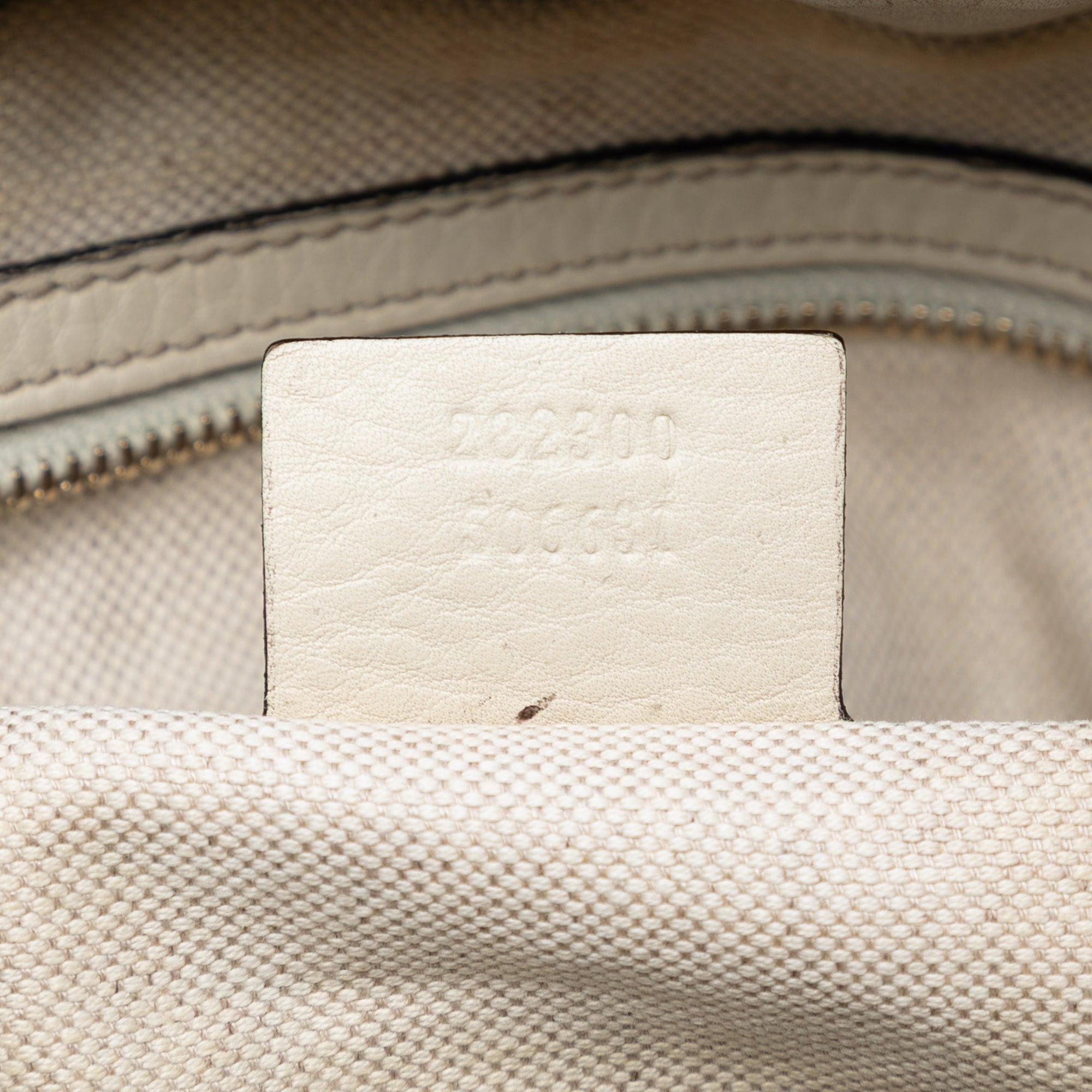 Product Details: White Gucci Pebbled Calfskin Bella Satchel. The Bella satchel features a leather body, a leather braided handle, a detachable and adjustable flat leather strap, a top zip closure, an exterior zip pocket, and interior zip and slip pockets. 9.1" L x 12.2" W x 5.9" D, 7.3" drop. Serial number 282300 506631.