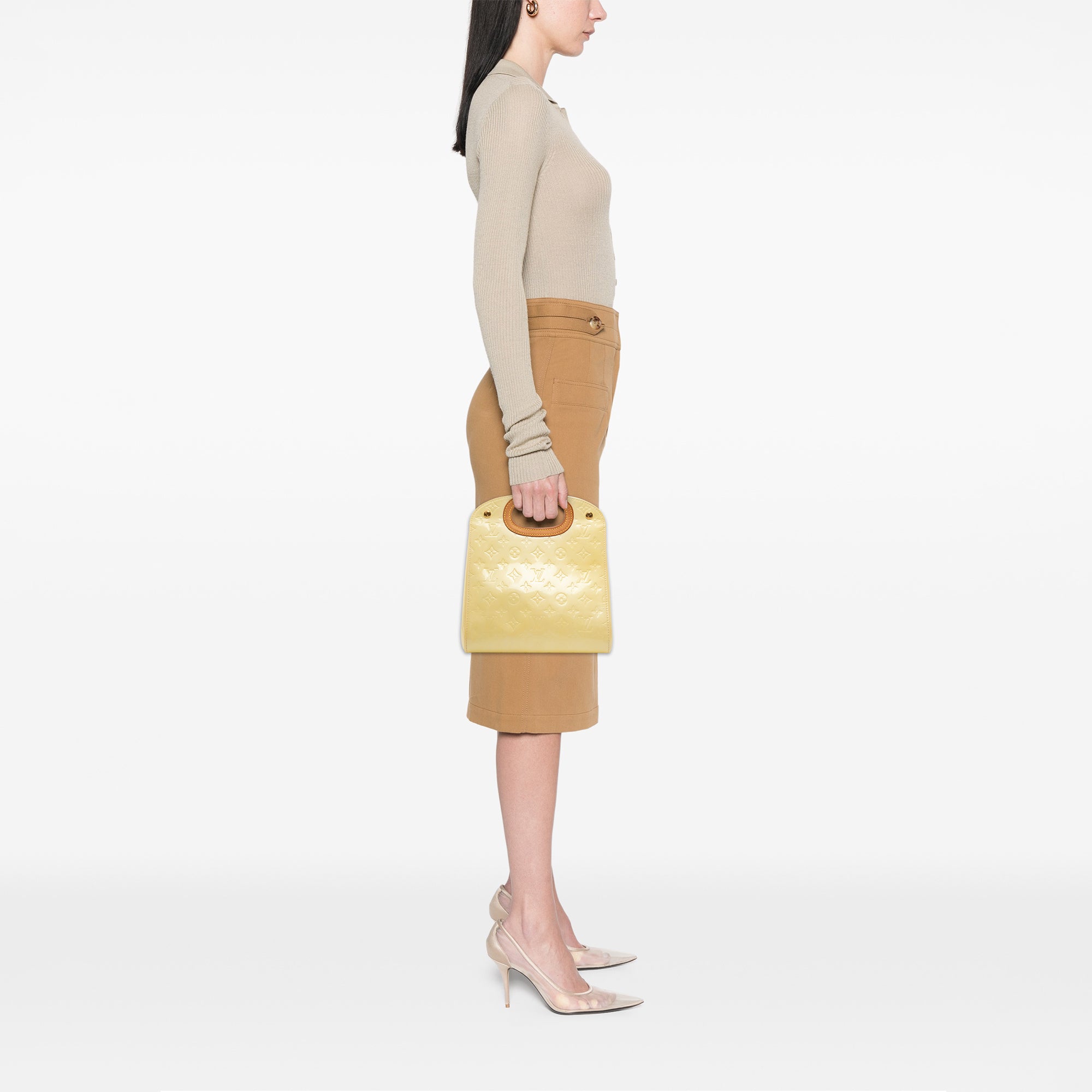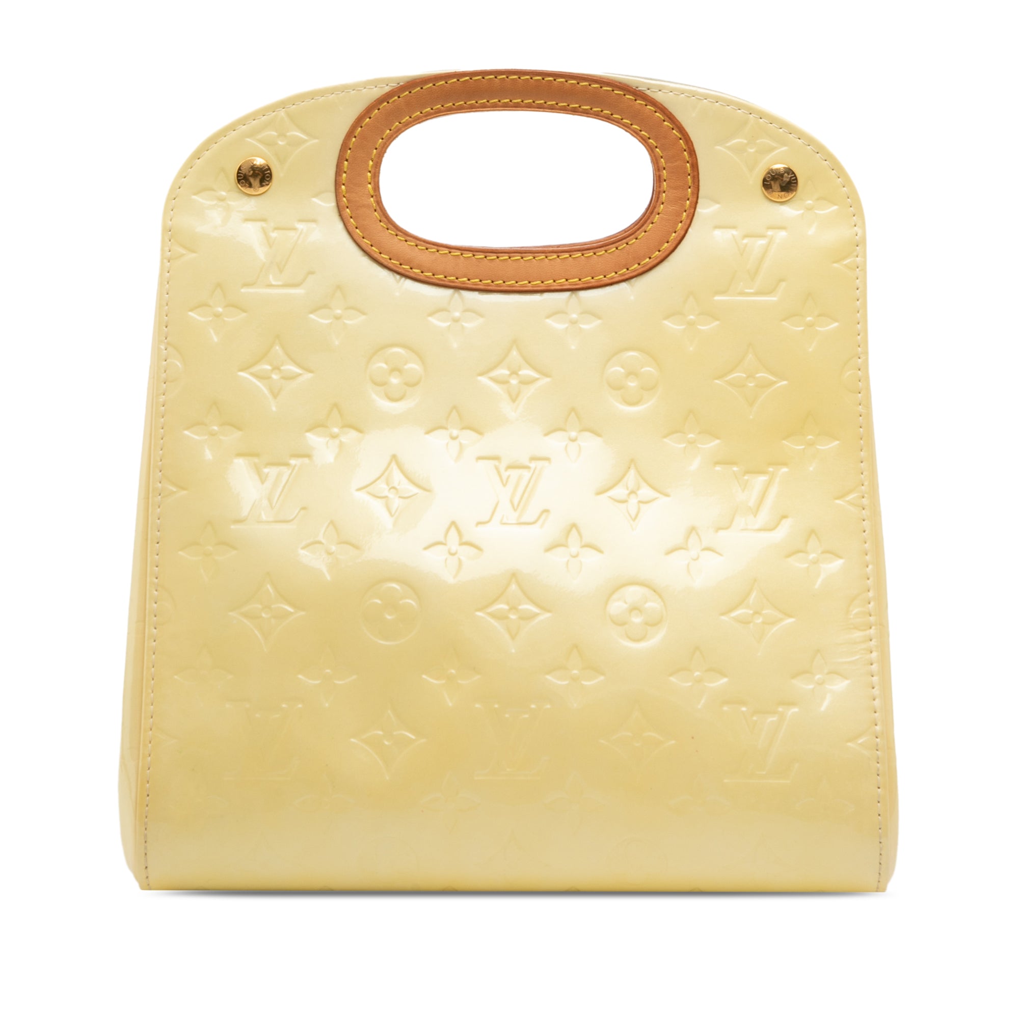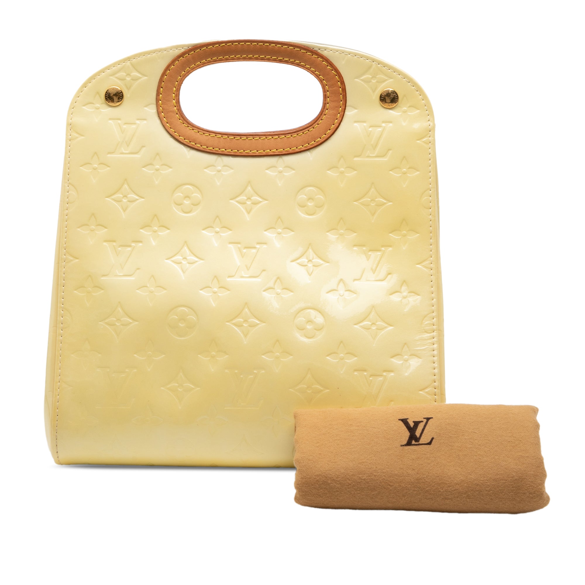 Product Details: White Louis Vuitton Monogram Vernis Maple Drive Handbag. The Maple Drive features a monogram vernis leather body, cut out vachetta leather handles, a top button clasp closure, and an interior slip pocket. 10.6" L x 9.4" W x 4.7" D, 2" drop. Serial number LM0075.