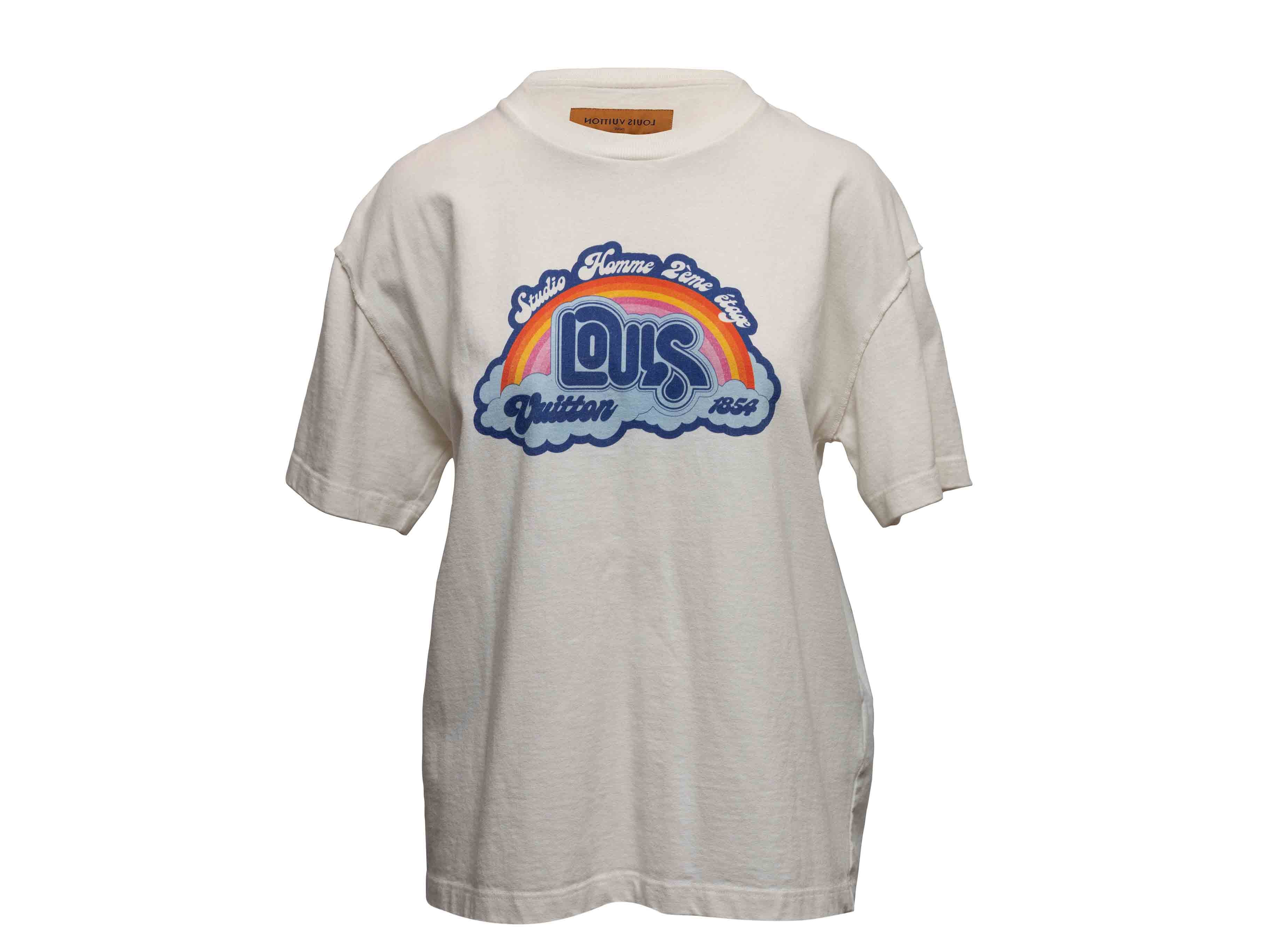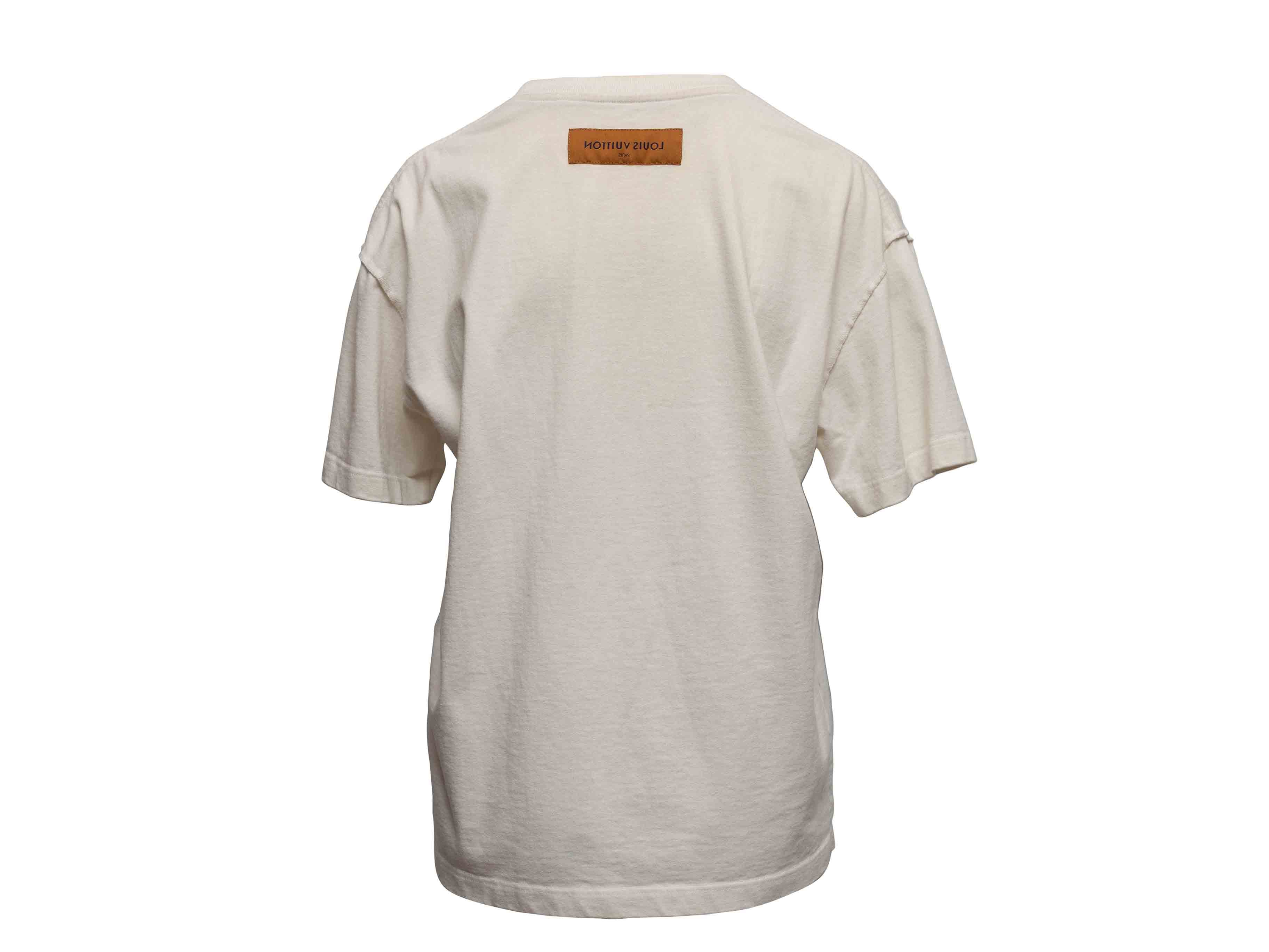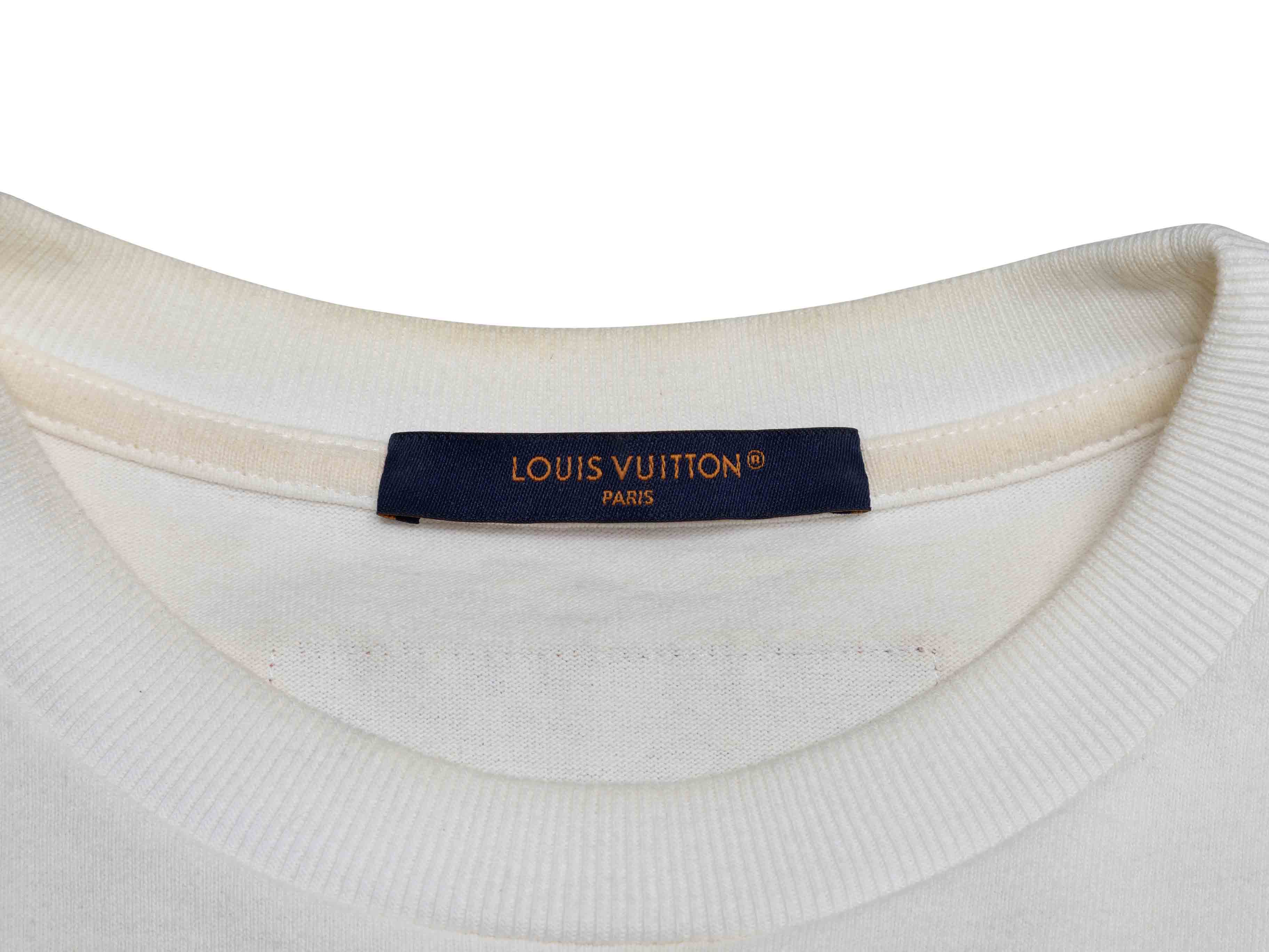Product Details: White and multicolor logo graphic print T-shirt by Louis Vuitton. Crew neck. Short sleeves. 39" bust, 20" shoulder width, 27" length.