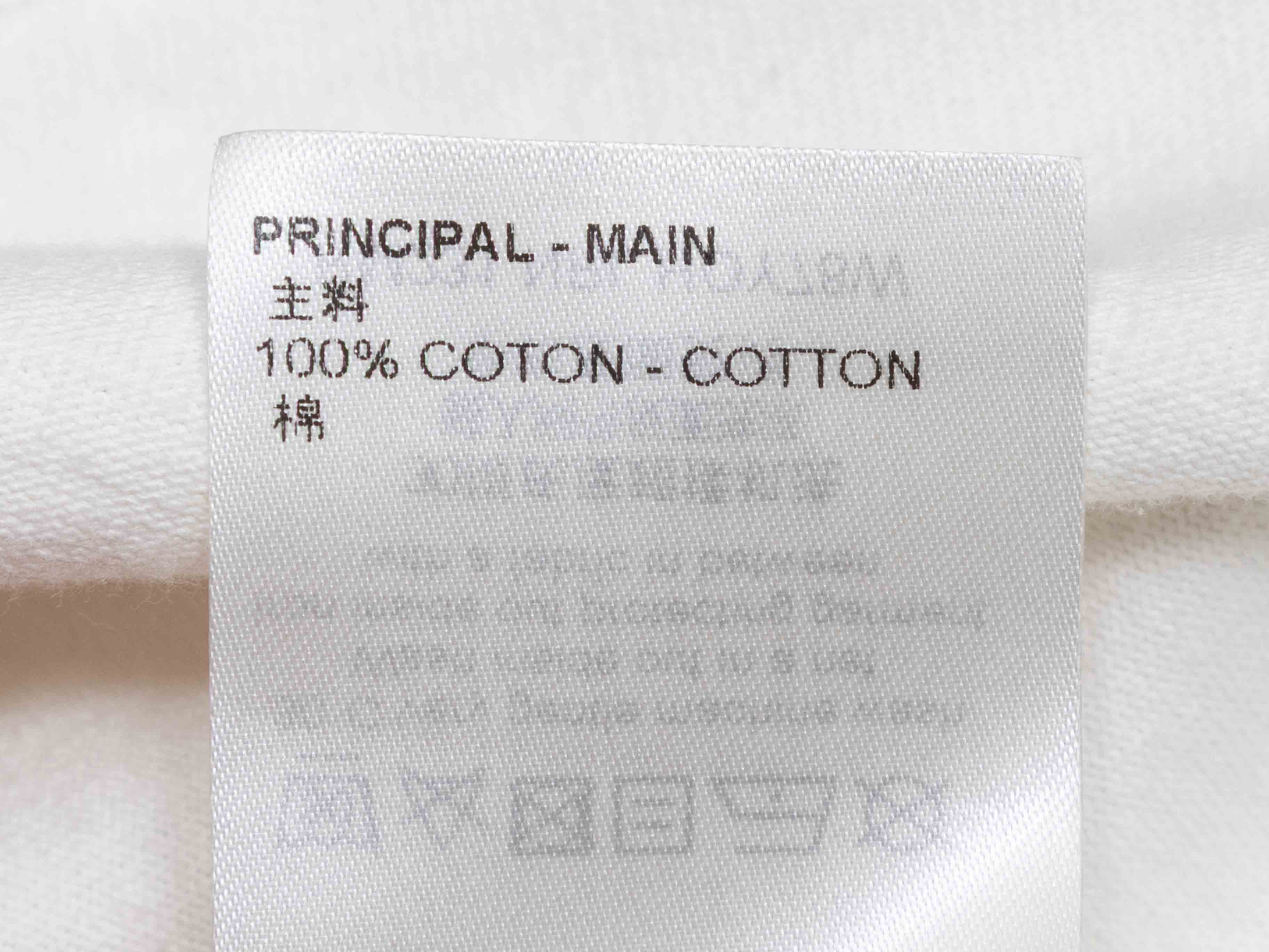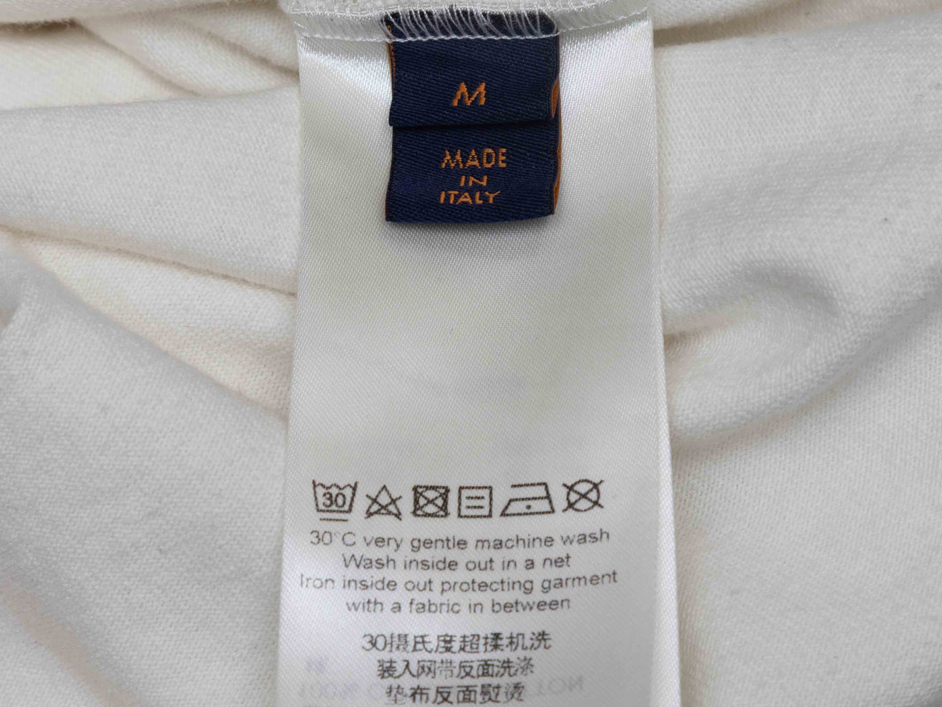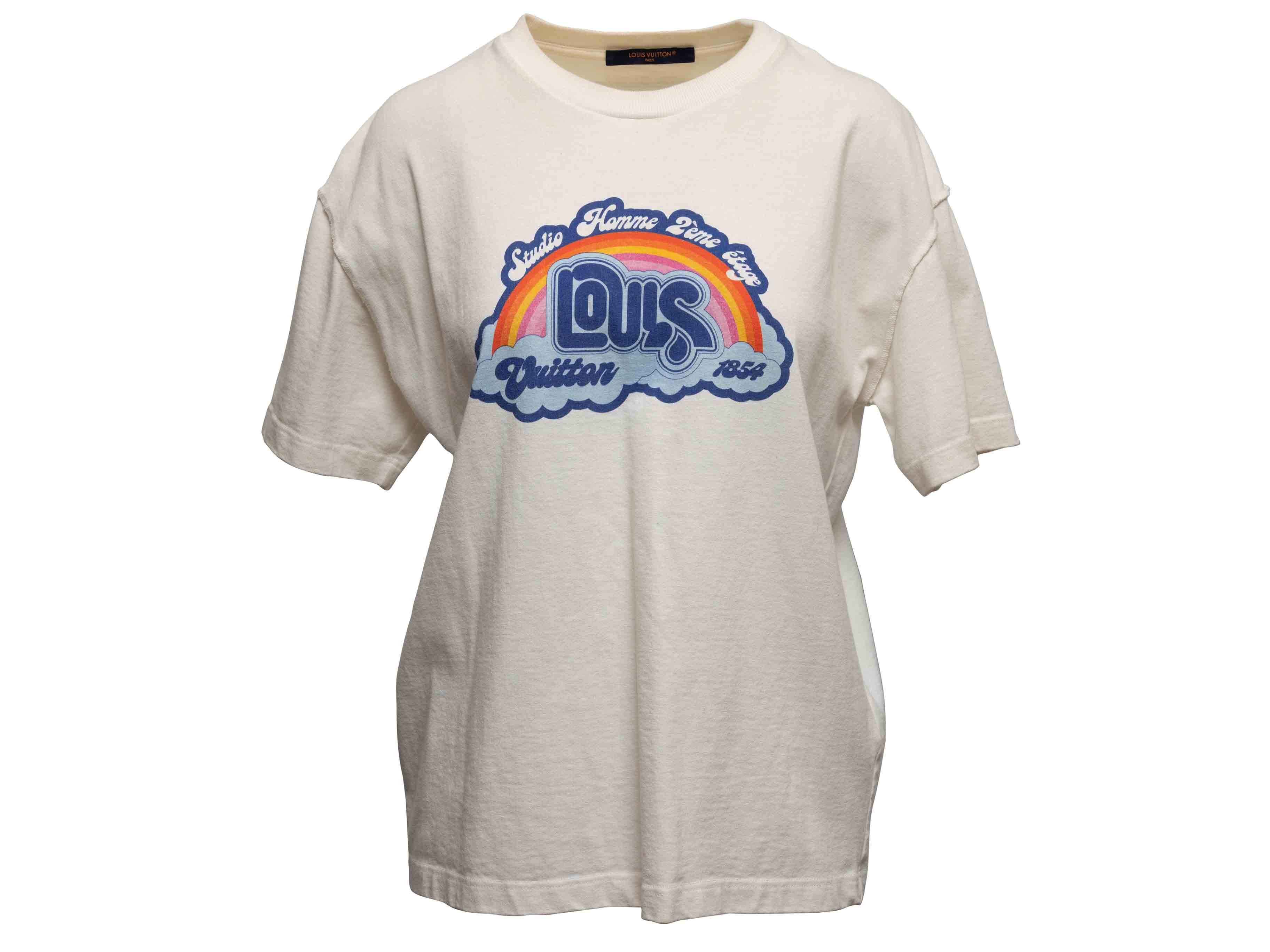Product Details: White and multicolor logo graphic print T-shirt by Louis Vuitton. Crew neck. Short sleeves. 39" bust, 20" shoulder width, 27" length.